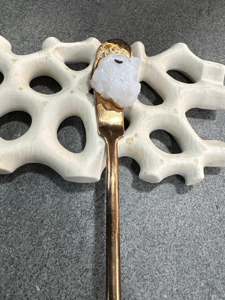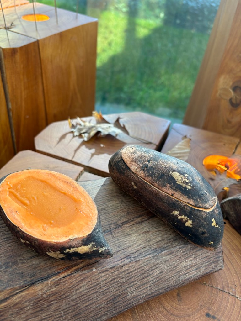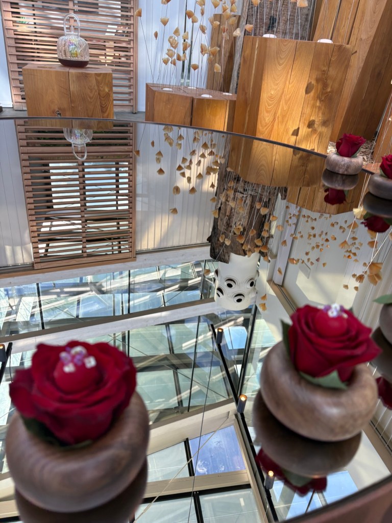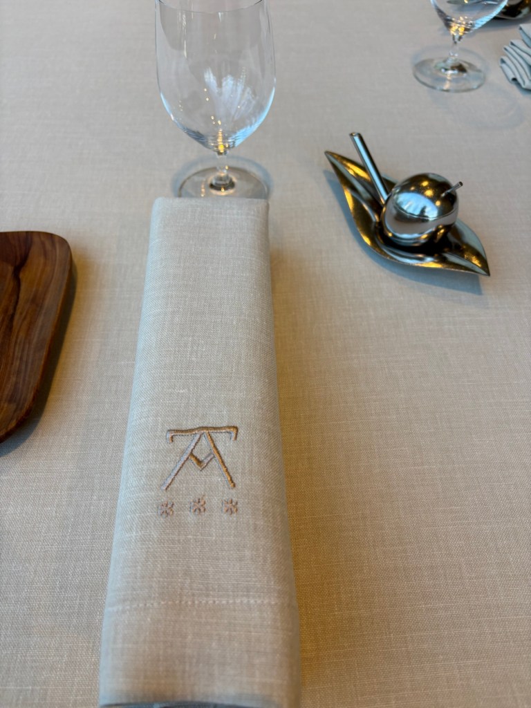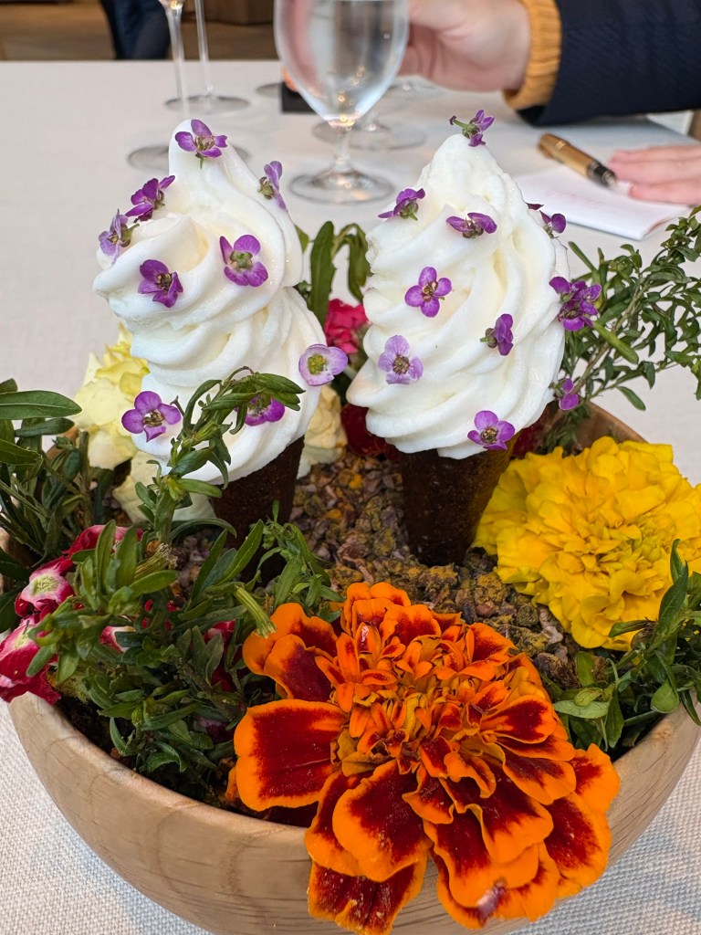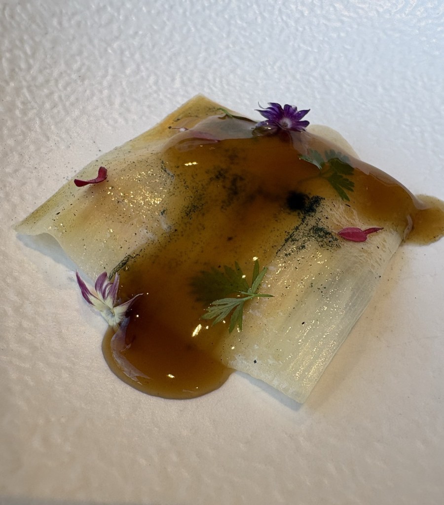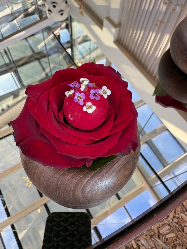 Antes, en una esquina de la caja de cristal, había un huerto. Ahora es un resplandeciente cubículo que es un mágico prado de flores (hechas con los residuos orgánicos del restaurante) que atrapan la luz, espejos y capullos de rosa. Una suerte de instalación de gran belleza, en la que tomamos agua de manzana y flores, un leve barquillo de calabaza y espárragos, helado de boniato con ahumados de chimenea y un delicado y hermoso bombón de fruta de la pasión y Dom Perignon Rose, escondido entre las rosas.