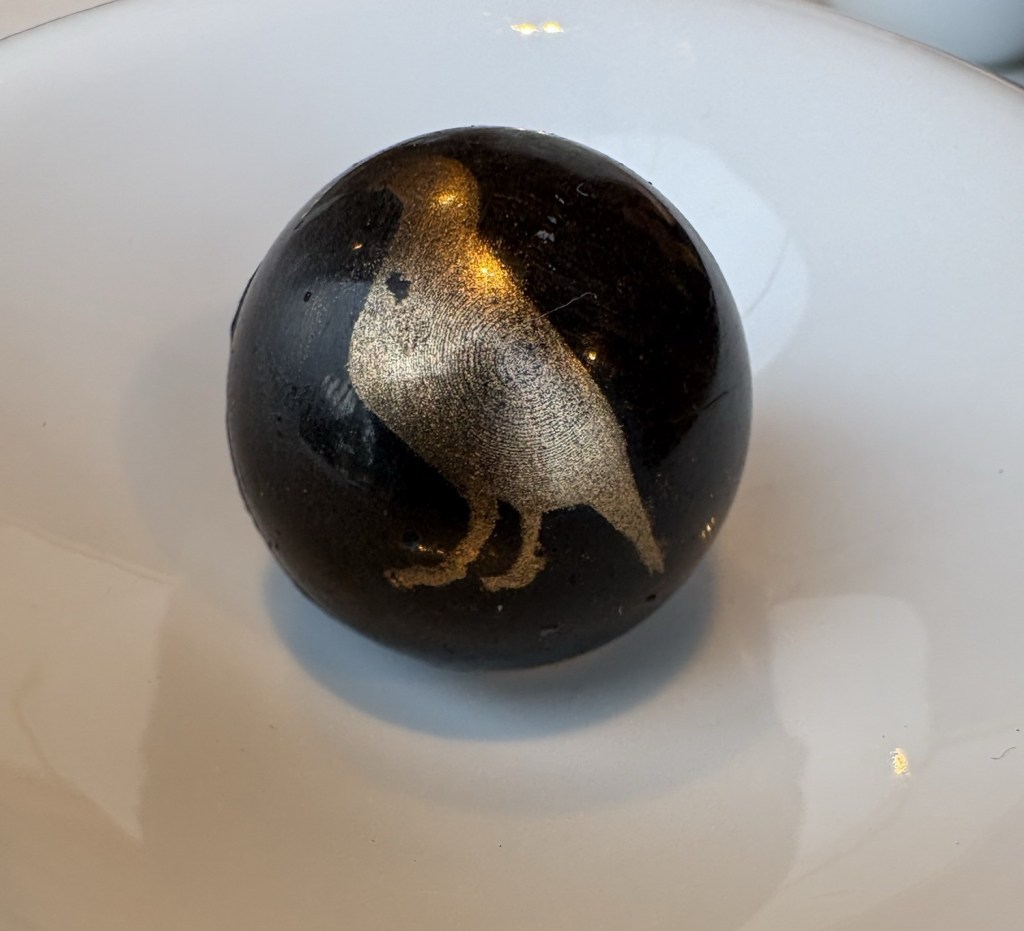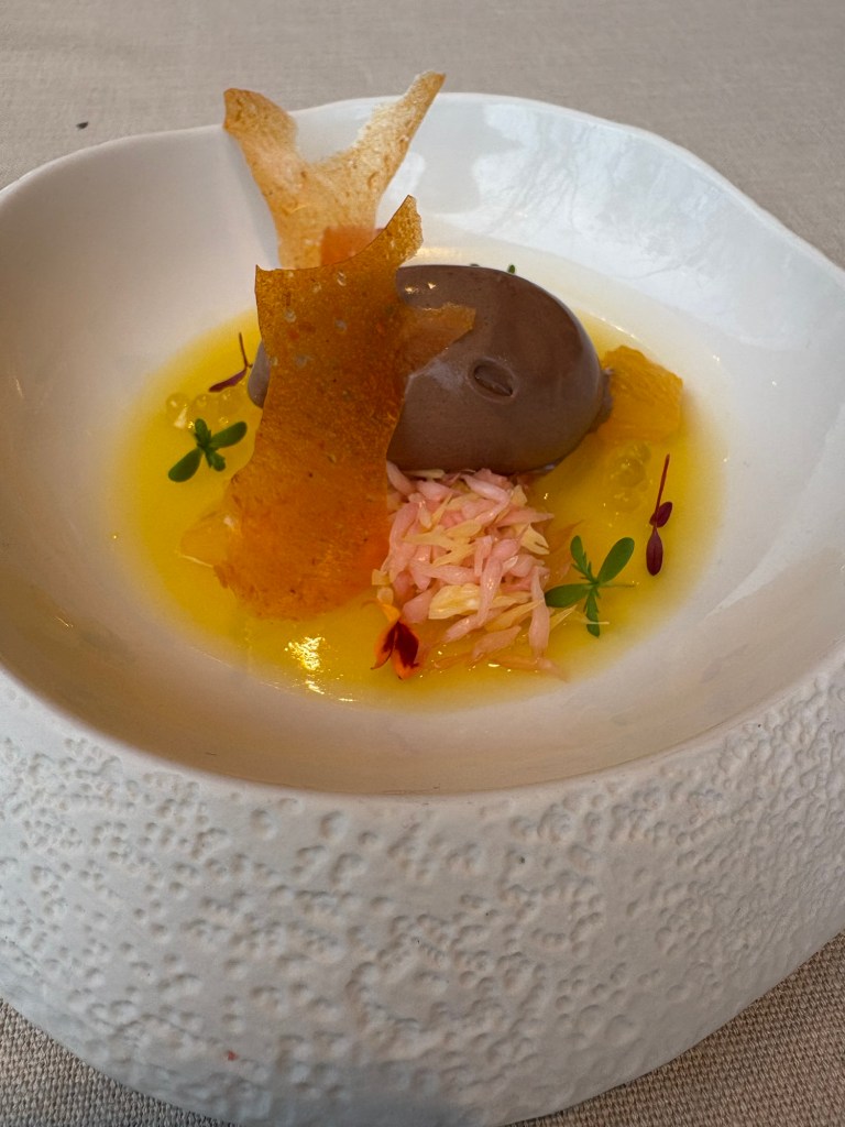 Lo que es un auténtico bombón es una esencia perfecta de la perdiz al chocolate y que mejor que concentrarla en un uno de cacao puro relleno del guiso. Una proeza de simplificación y elegancia.
