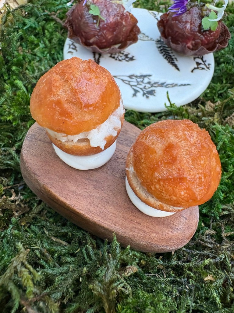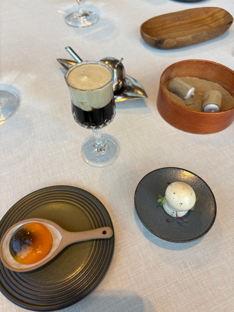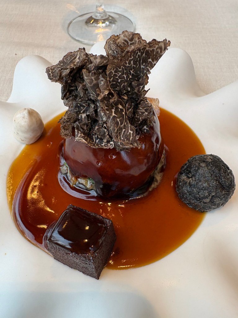 En el comedor asomado a los verdes prados, merengue de cerveza y setas, cilindros de boletus rellenos de lo mismo, un gran caldo de setas coronado de espuma y el súper copiado (por quien puede) huevo trufado, una yema que vacía en parte para rellenarla de jugo de trufa caliente para que se haga de dentro afuera. Asombroso de aspecto y arrebatador de sabor.