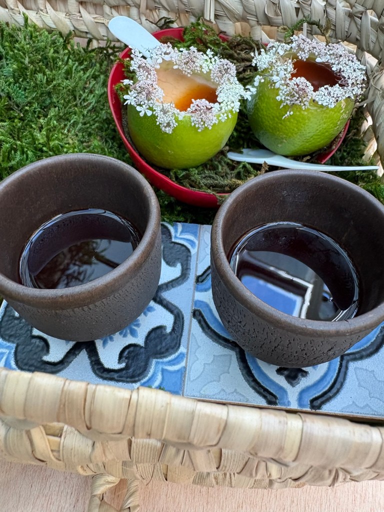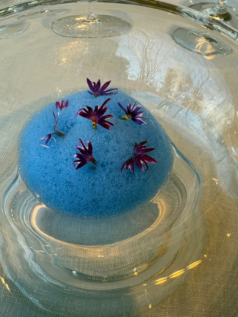 Más maravillosos azules en una espuma de espirulina cubierta de flores que esconde erizos anaranjados perfumados con manzanilla de Sanlucar.
