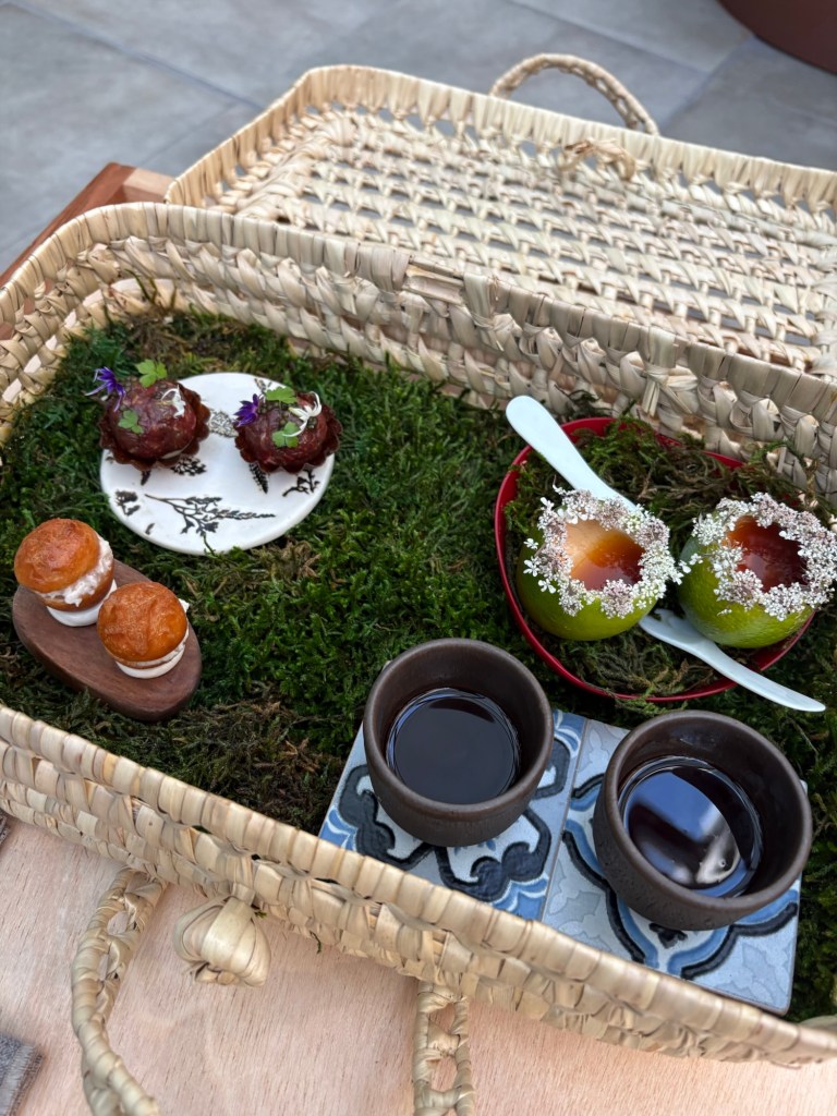 Dentro de la cesta, un potente tartar de Betizu (la vaca autóctona) con mantequilla de chimenea y caviar; un sabroso brioche de salazones (anchoa y anguila ahumada), la delicia clásica del “limón grass” relleno de una deliciosa espuma de foie y caramelo de limón, en gran contraste; y un estupendo y fuerte jugo reducido de alubias de Guernica. De Euskadi al mundo.