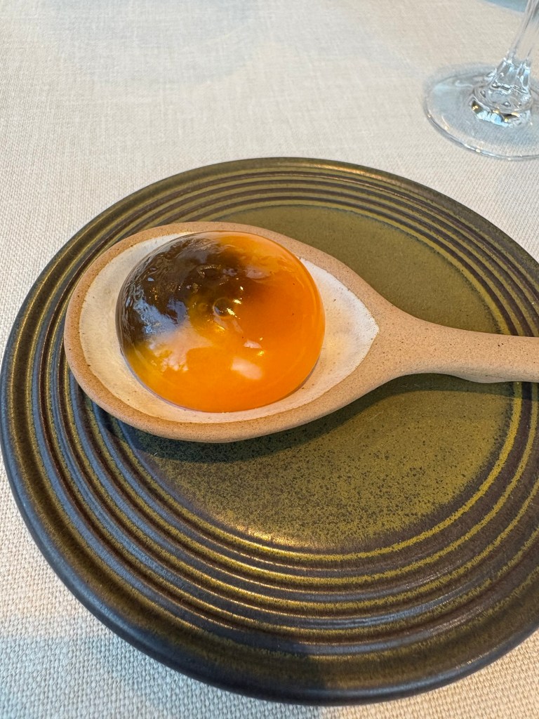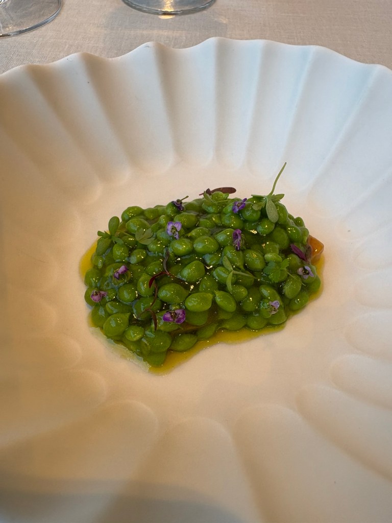 Llegan los intensos verdes de los guisantes lágrima de Pau Santamaría, salteados con gel de jamón ibérico y hierbas sobre un flan (bravo, no lo llama chawamusi) de pato marinado y curado en sal. Una mezcla de huerta y granja increíblemente perfecta y equilibrada.