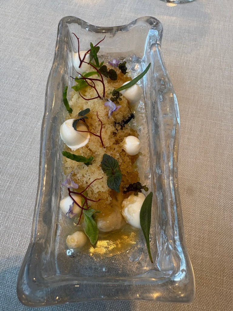 Antes que nada, un gran pan al vapor con suave aceite, acompaña a un jardín de ostras cubiertas de granizado de algas y brotes del mar y cremosa emulsión de ostras, una fresca combinación marina que mejora en mucho a la simple ostra.