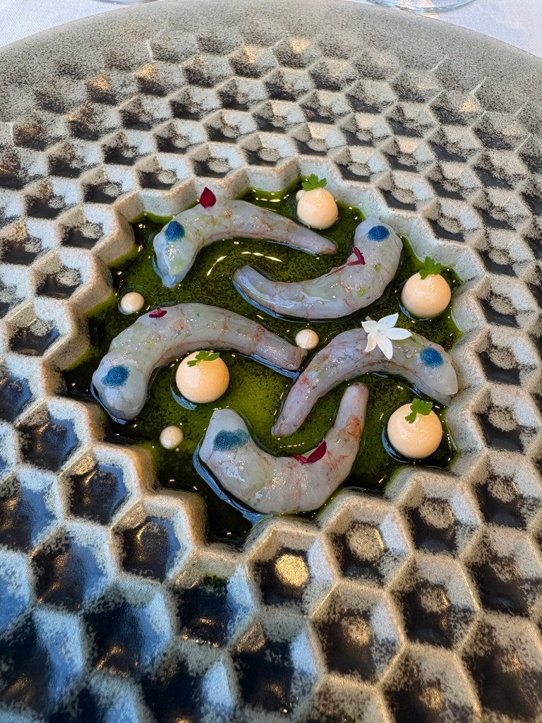 Lo mismo pasa con unas suaves quisquillas marinadas y con sus huevas, sobre aceite de finas hierbas y emulsión de sus cabezas, un lienzo bello de verde, rosados y azules.