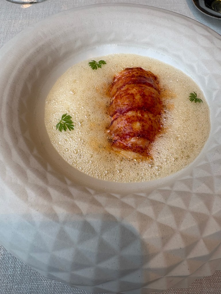 El bogavante siempre es lujoso, pero más si se sumerge en un potente caldo de legumbres muy concentrado y se acaba con el toque afrancesado, no de una salsa sino de un aire de mantequilla y las carcasas. Una delicia moderna que recuerda sabores clásicos.