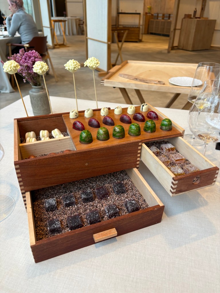 El chocolate del final se mezcla con cítricos entre los que resalta el pomelo y aceite de oliva, un juego de sabores sencillos y magníficos que abren paso a una enorme caja de pequeños dulces que recuerda a la mítica de El Bulli, llena de cajoncitos y sorpresas.