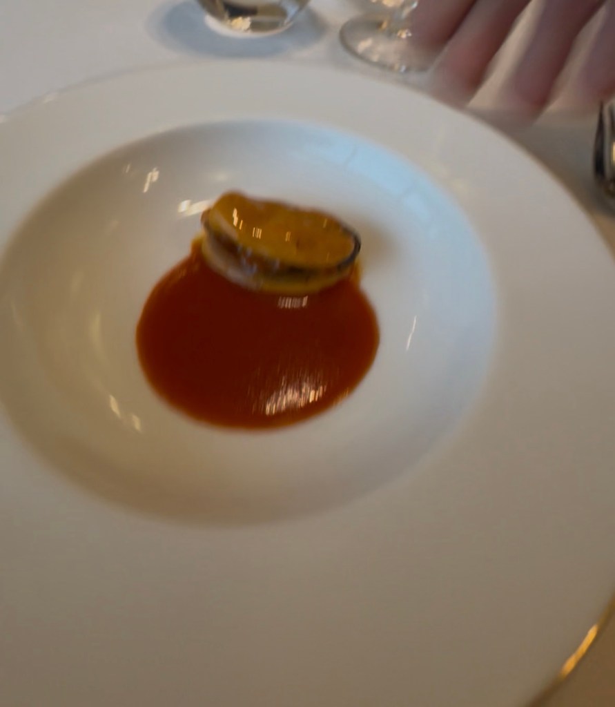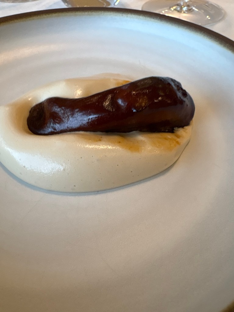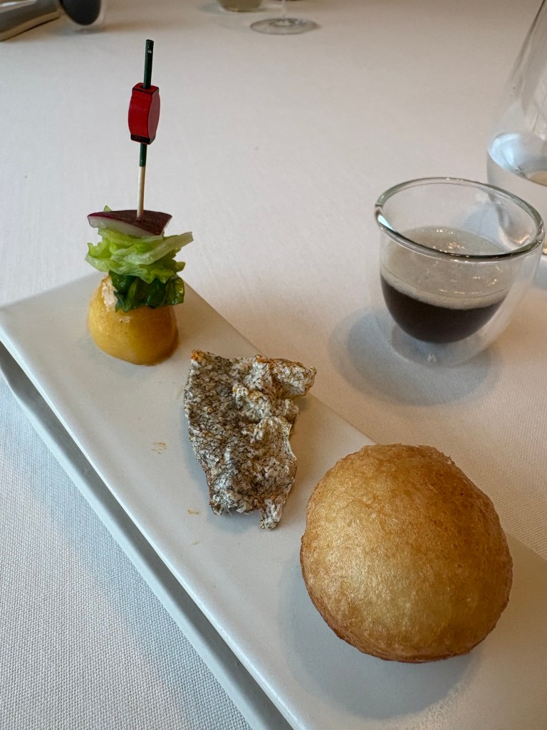 Comienza despacio con un homenaje al poteo (tapeo) vasco y le bastaba un grillo (lechuga, patata y cebolla en pincho), un torrezno de bacalao que convierte en perfección, una profundísima crema de alubias de Guernica con espuma de berza y un buñuelo -esponjoso y crujiente mantou-, con sus sacramentos, una espléndida morcilla de puerros.