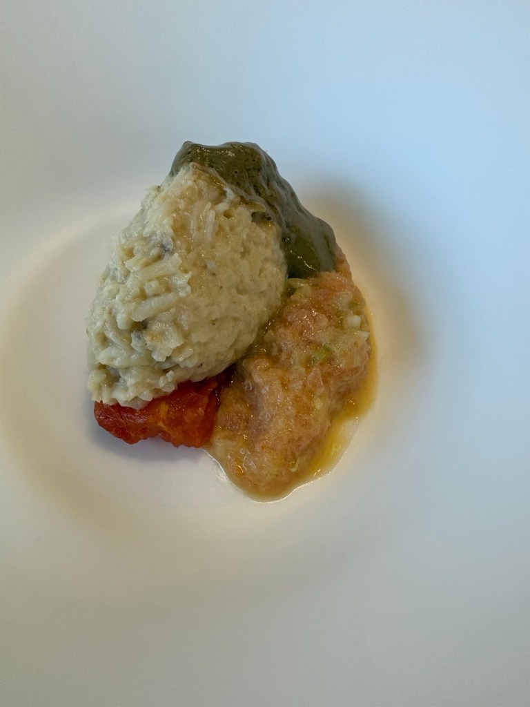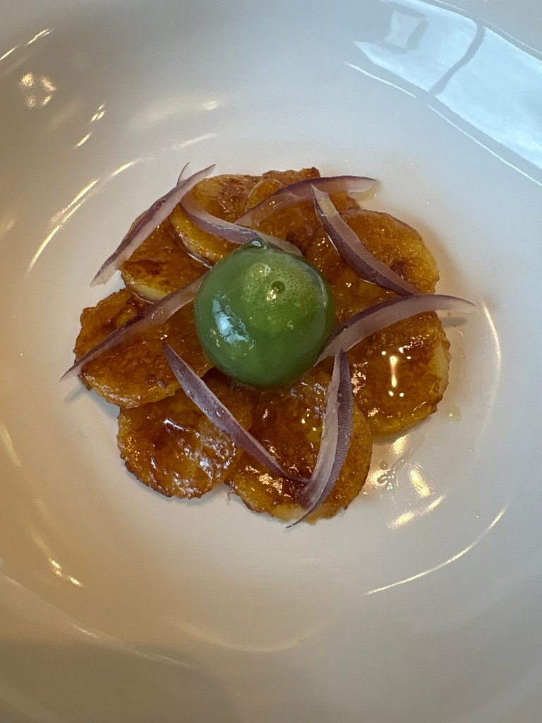 La versión aristocrática del grillo es una esnsalada de patata y cebolla roja en la que la lechuga es una esferificación que inunda todo de frescura al romperse. Con poco y en diferentes formatos hace un gran plato, con nada algo muy bonito.