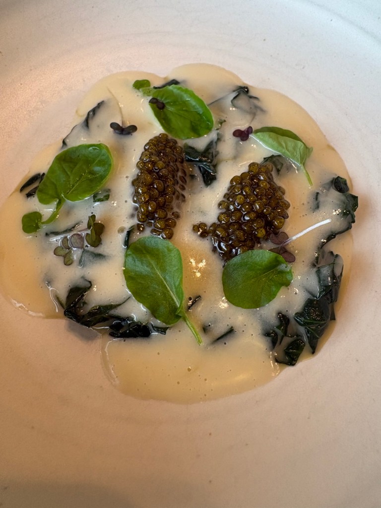 Perfecto para la densa salsa de coco que cubre unas espinacas guisadas con berros y caviar, un conjunto de sabores en audaz equilibro porque un gramo más de caviar o de coco arruinarían el estupendo y sorprendente plato.