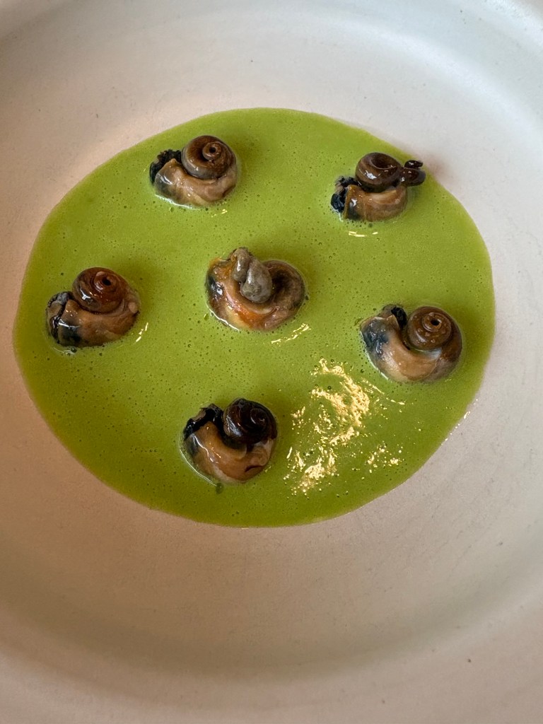 Bígaro en vasco, karrakela, es más bonito y cosa tan humilde, se transforma en bocado delicado con un simple, profundo y fresco jugo de vainas. Simplicidad convertida en grandeza.