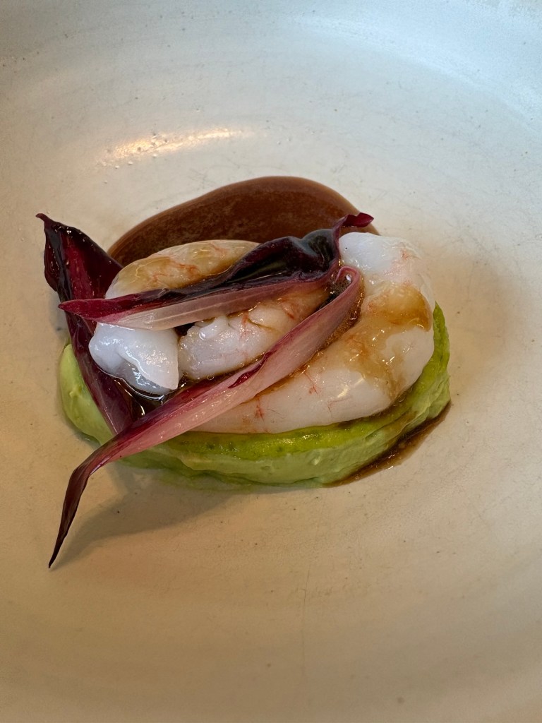Elevar así los vegetales es una labor magistral y lo mismo pasa con un pastel de brócoli, de estupenda textura de cuajada, que iguala a unas dulces y suaves quisquillas. Además, un gran dashi con un toque de clavo.