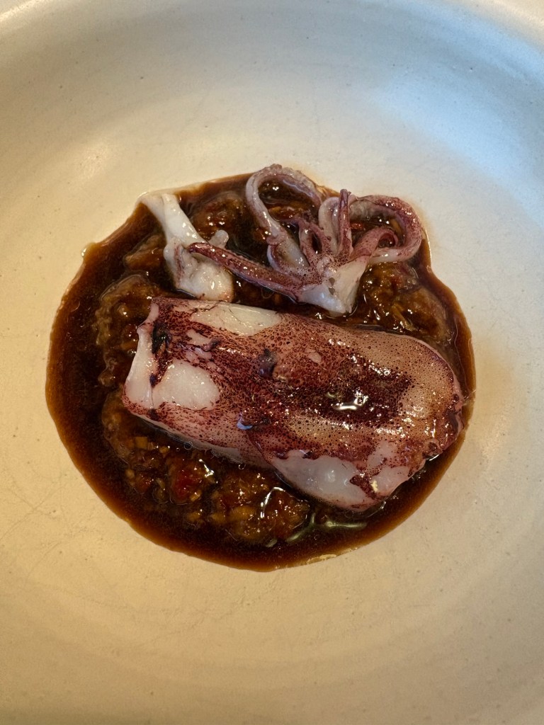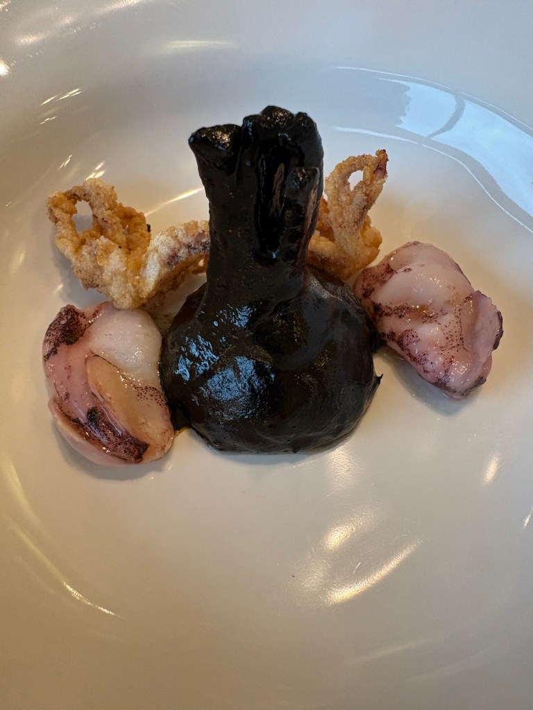 La alcachofa glaseada en tinta preside un plato con chipirón a la plancha y frito, nada menos que en aceite de café. Impresionante.