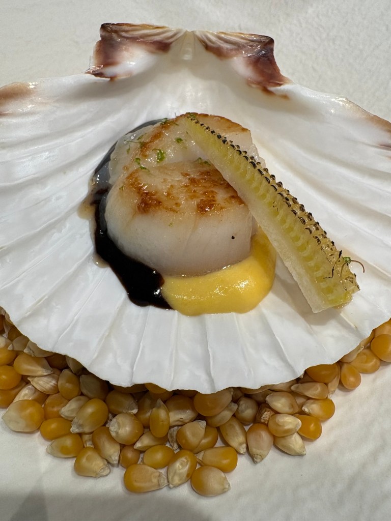 En una estupenda barra teppanyaki monacal (refractaria al espectáculo), los tres chefs ofrecen un espectáculo elegante que comienza con una vieira a la mantequilla tostada sobre dos estupendas salsas de ajo negro y maíz dulce.