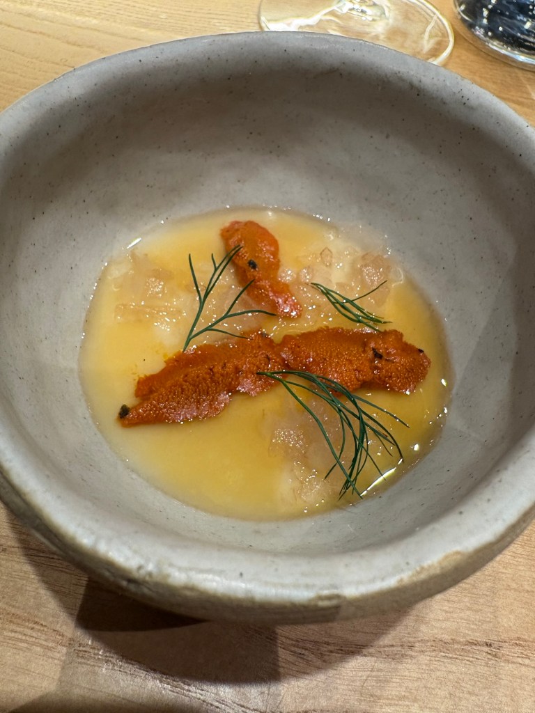 El chawamusi con erizos y varias texturas de pera japonesa es excelente, a pesar de quedar aparentemente cortado con los dulces líquidos frutales que combinan con los dulzores del erizo.