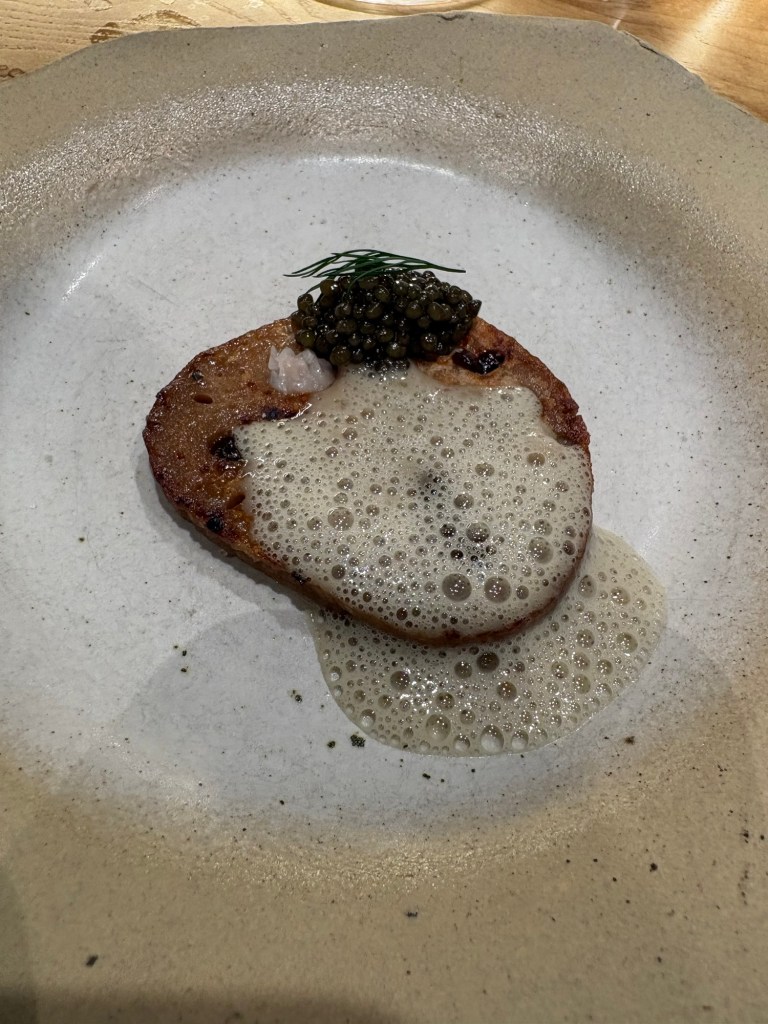 El loto marinado en soja y cocinado con mantequilla, se envuelve en una espumosa salsa de mantequilla y cebada que se anima con caviar. De lo solo a lo untuoso y marino.