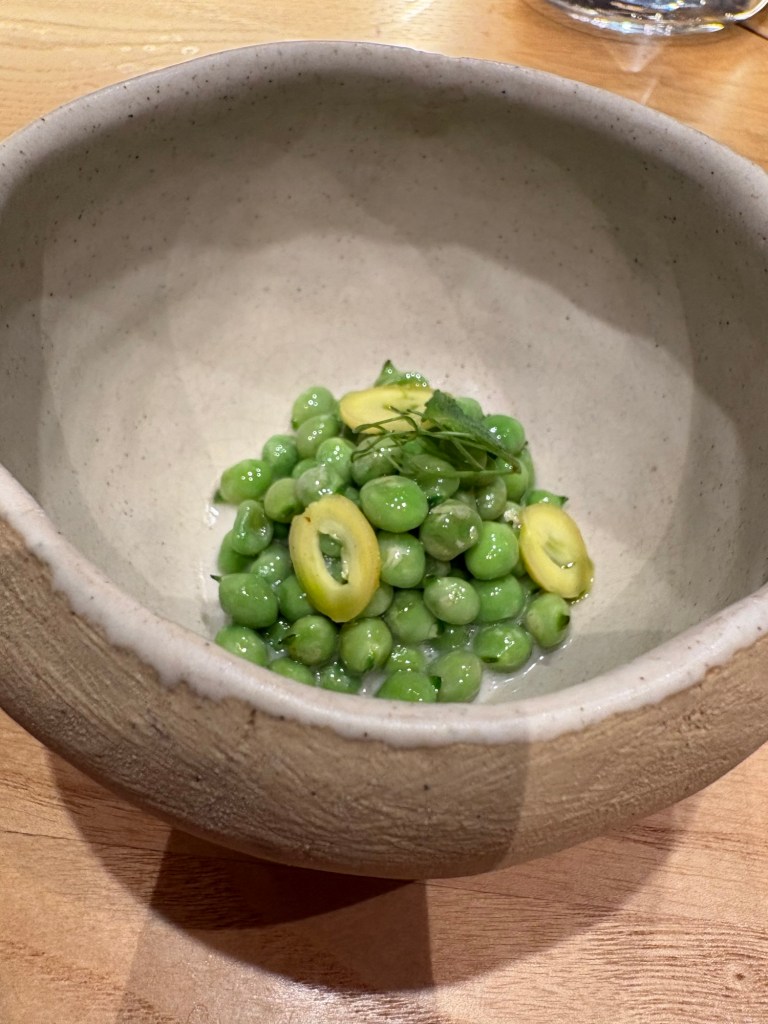 Unos guisantes de tamaño medio, muy delicados, se saltean con grasa de vaca y se salsean con un pil pil de lo mismo. Para rematar nuez de ginkgo, un delicioso fruto con sabor a flores amargas.