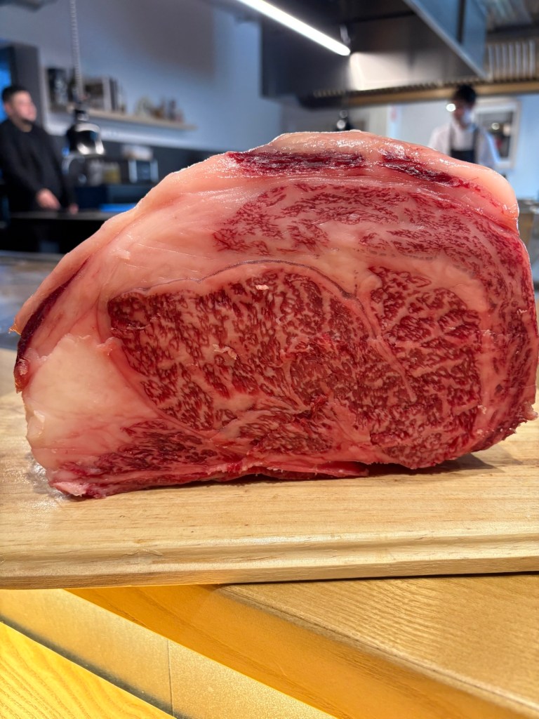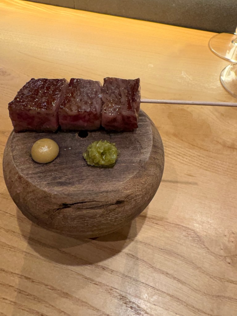 La brocheta de waygu A4 es tan espectacular que no necesita más que un poco de crema de ajo asado y algo de punzante de yuzu kosho.