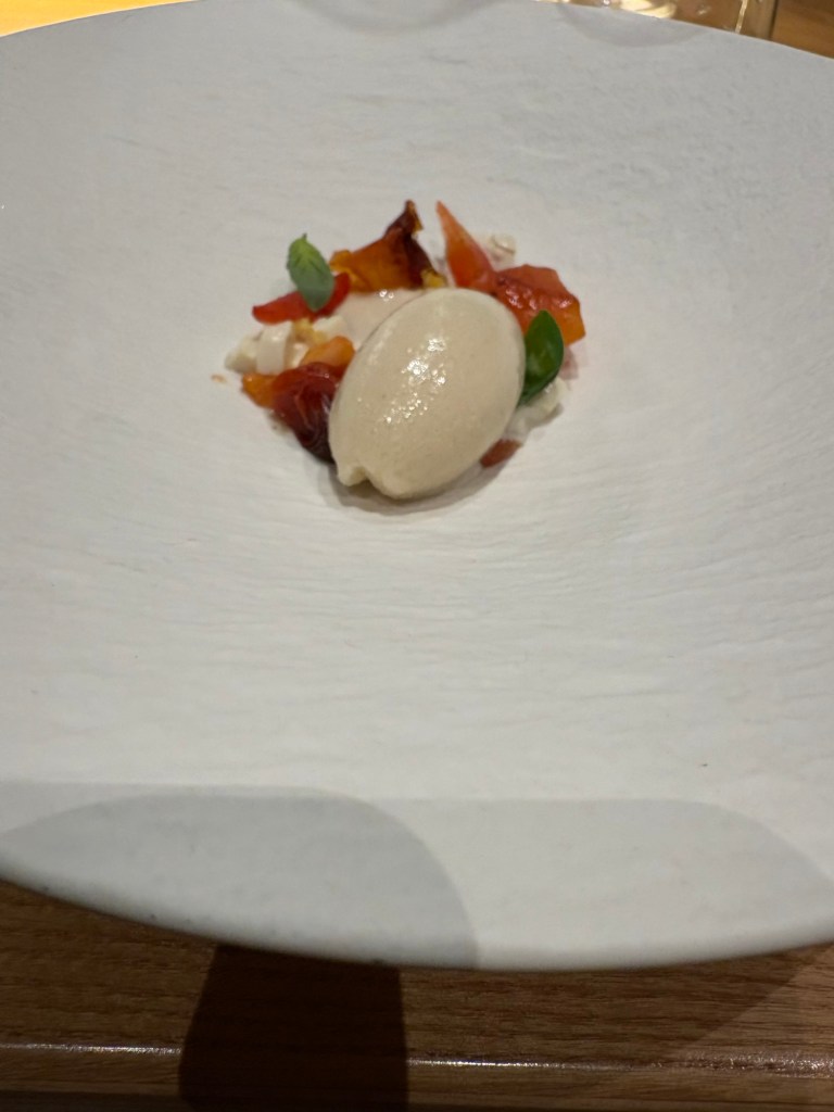 Los postres, en línea japonesa, lo más flojo. Y en línea española, también. Un helado de tofu (por qué no prohibirlo?) con tomate, ciruela y un gran licor japonés de solo 9º. Para acabar, helado de setas con caviar que más me hubiera gustado en las entradas. La eterna asignatura pendiente de la gastronomía española. Con perdón del gran Jordi Roca.