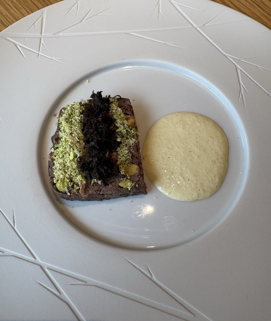 Afrancesa Extremadura con una rica terrina de liebre con pistachos y trufa y una audaz mayonesa de piparras (en vez de encurtidos) o unas trompetas con una gran salsa de foie, profunda y cremosa.
