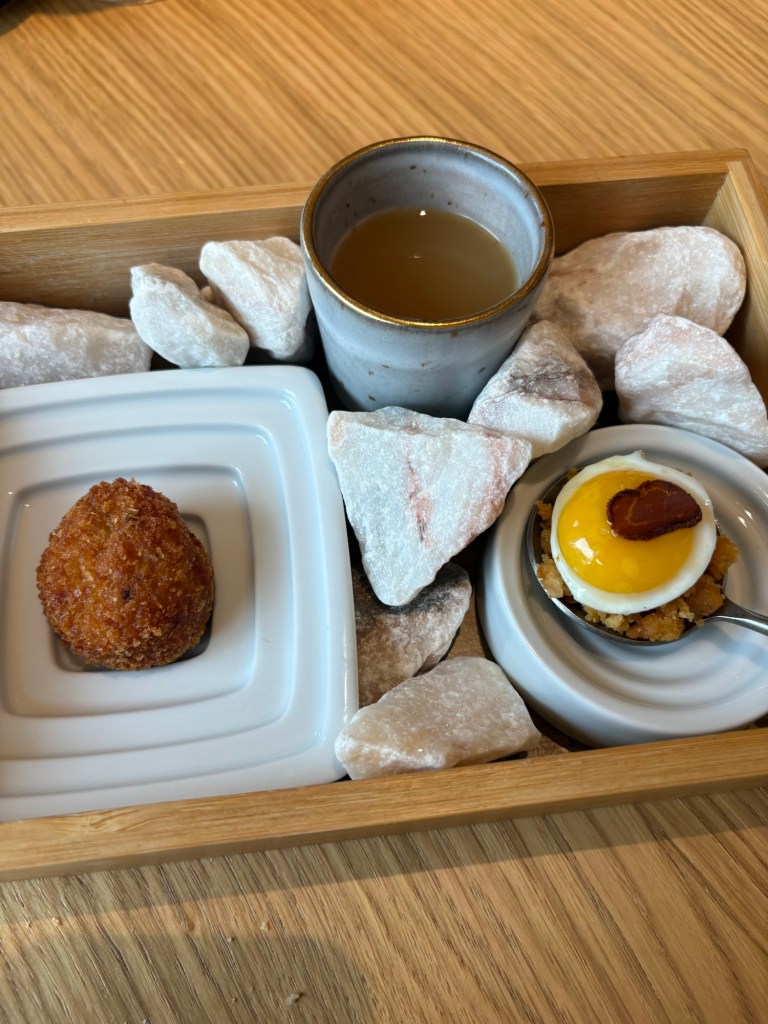 Sin olvidar su tradición, como hace empezando con pan y mantequilla ahumada (de sus propia quesería) y un aperitivo de migas con pimientos y huevo de codorniz, crujiente croqueta de sopa de tomate con albahaca y hierbabuena, y un gran consomé de perdiz al oloroso.