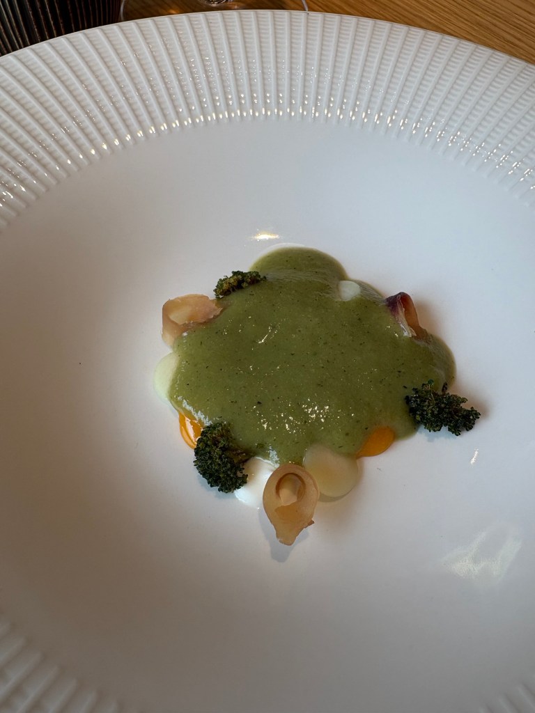 De la huerta es un brócoli en varias preparaciones y con pichón, rematado por una gran crema de la verdura a la brasa.