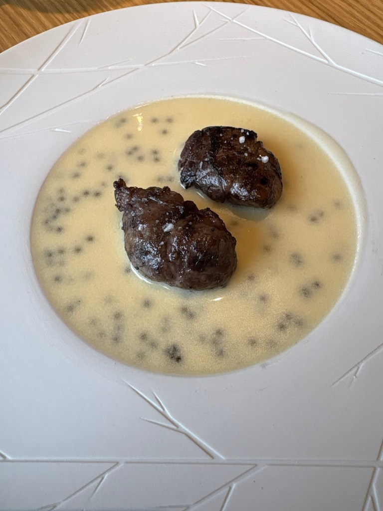 Deliciosas unas suaves mollejitas de cerdo que se quedan algo diluidas por la rotundidad dulce y ácida de una gran beurre banc de caviar.