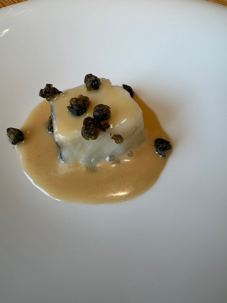 El humilde (antes) bacalao tiene una muy buena salsa grenoblesa de oreja, además de alcaparras fritas y el toque disruptivo de la fresa ácida.