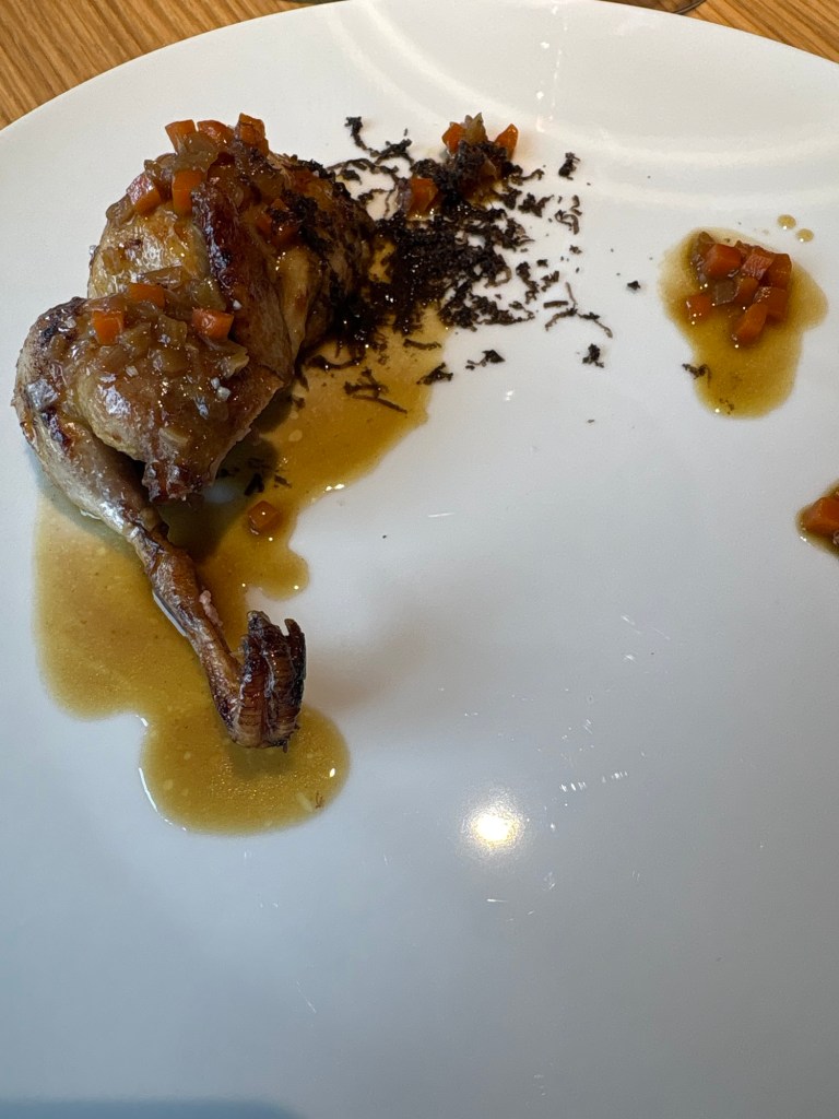 Para acabar, una gran codorniz estofada, rellena de verduritas y foie.