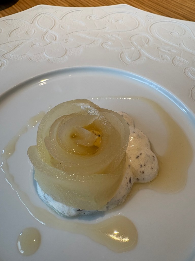 Para llegar a la suculenta pera confitada en vino con crema de trufa, pasamos por unos buenos quesos locales y un gran sorbete de naranja con aceite y regañas, versión elegante de la merienda cacereña.