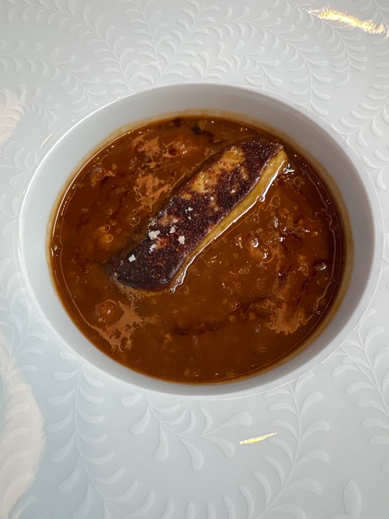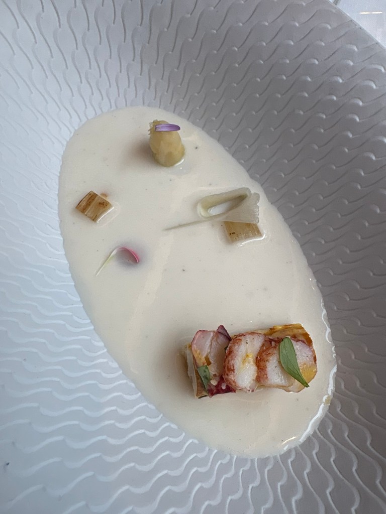 Nos han dado a probar una cosa nueva, entre la sopa ilustrada y el entremés de marisco: crujiente hojaldre de bogavante y gazpachuelo de espárragos, un elegante caldo untuoso con más del vegetal que de la naturaleza grasa del plato malagueño.