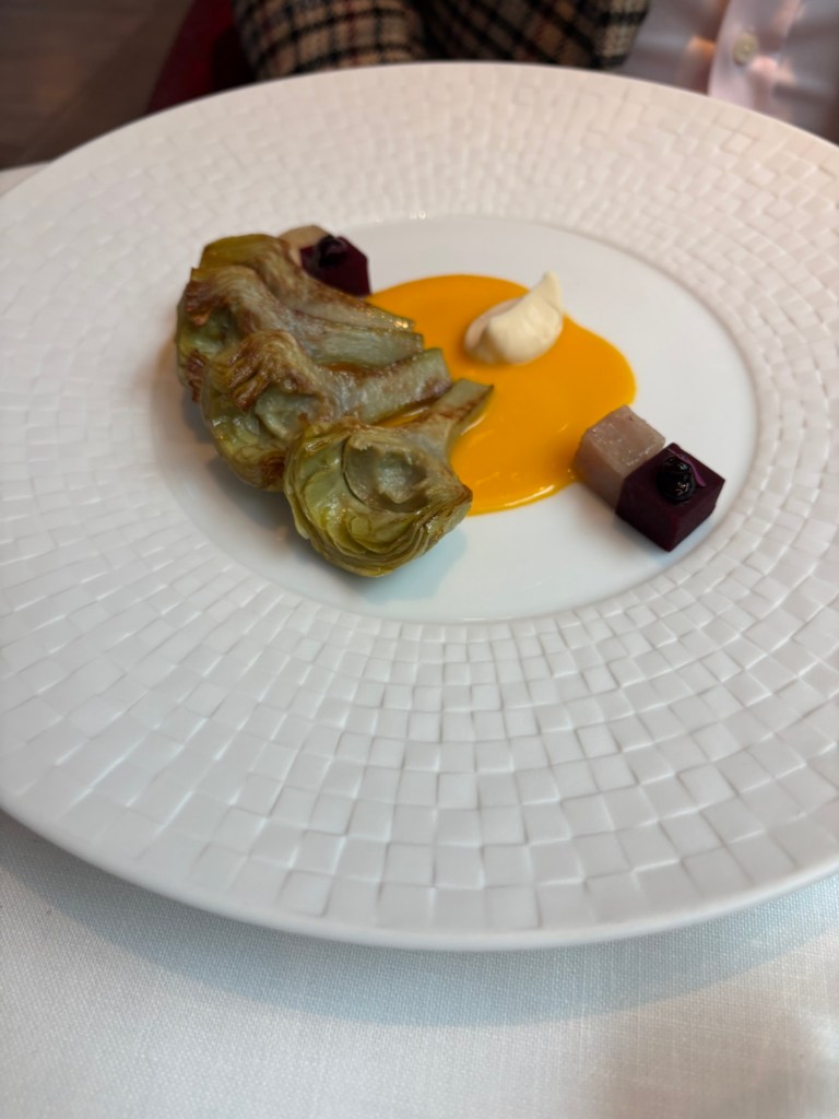 Las suculentas alcachofas a la brasa se envuelven en un aterciopelado sabayón de caldo de ave y “aliñan” con dados de papada. Para refrescar, otros de remolacha encurtida que a mí me resultan un contraste en exceso violento.