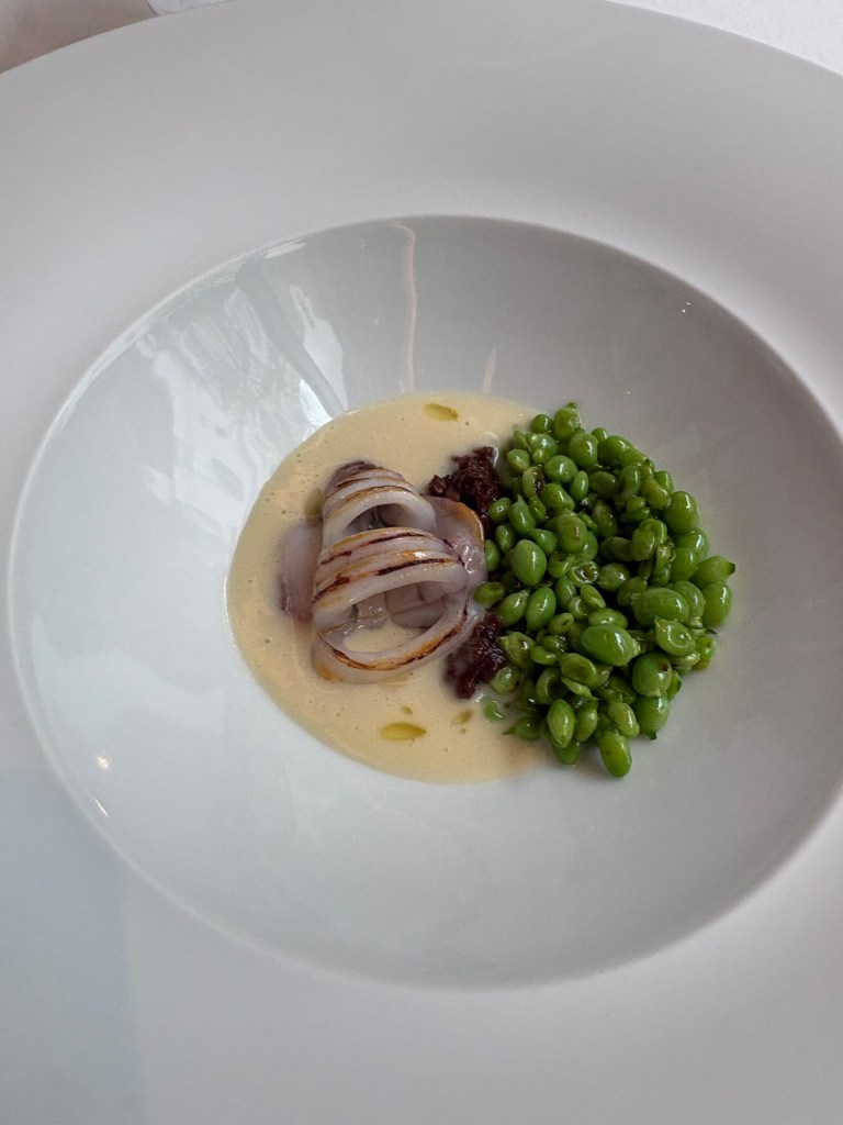 Los diminutos guisantes lágrima, apenas cocinados, se engalanan con una suave veluté de ajo tostado y un delicioso chipirón a la brasa con las patitas guisadas.