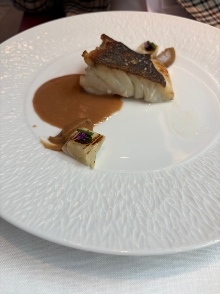 El mero es suave y lujoso -por la calidad del pescado-, y muy poderoso por una gran salsa de pescado que se refuerza con las espinas tostadas. Una endivia confitada es un gran acompañamiento.