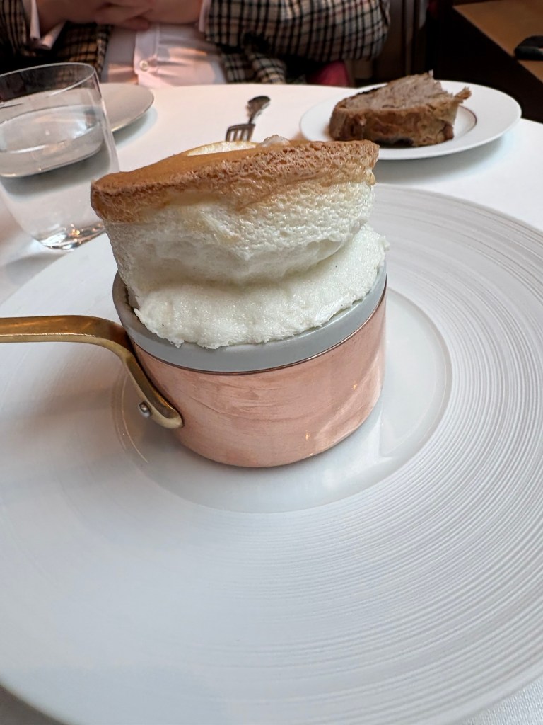 Eso ha pasado ya con un aperitivo de buñuelo de suave brandada de bacalao, que explota en la boca, o una reparadora (llovía, hacía frío) sopa de cebolla con espuma de setas y huevo escalfado.
