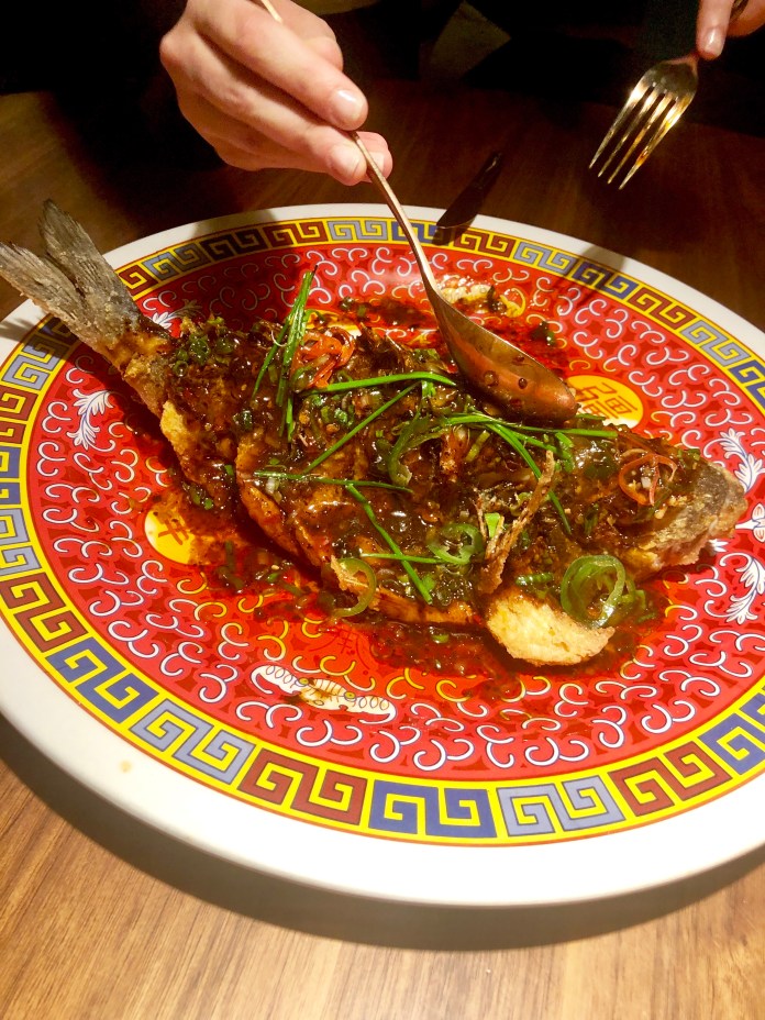 La gran dorada estilo tradicional llega a la mesa entera y en llamas. Primero se somete a un frito rápido al wok y después se flambea con algún tipo de licor chino. Y todo se envuelve en una espléndida salsa de soja agripicante de muchas verduras, hierbas y especias.