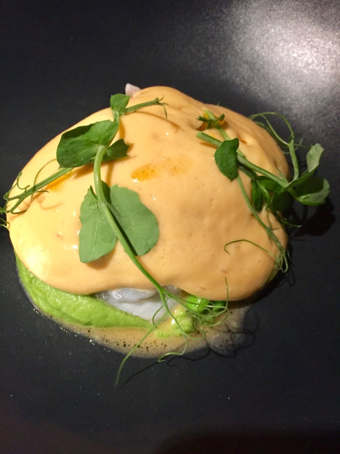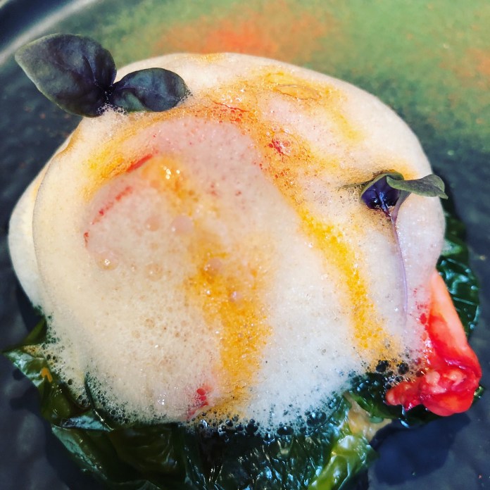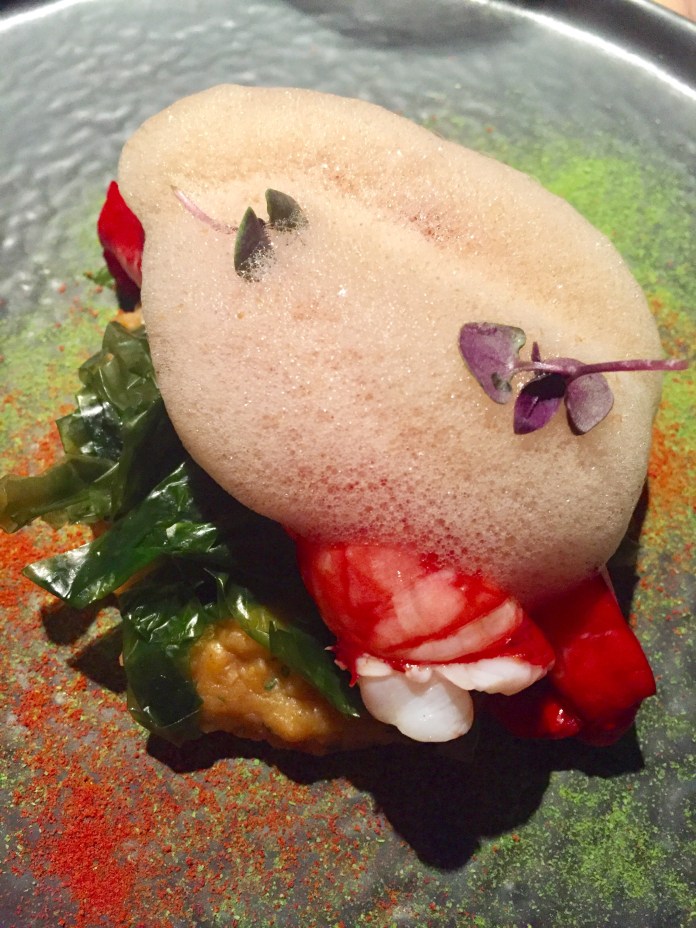 Los aperitivos comienzan con un crujiente de tapioca con mayonesa de ostras y un gazpacho clarificado con gel de aceite de poleo. La rústica presentación recuerda las de Central, el gran restaurante peruano del momento. Ambos bocados realzan los sabores extrayendo su esencia, el primero con esa intensa mayonesa de ostras y el segundo convirtiendo el gazpacho en infusión.