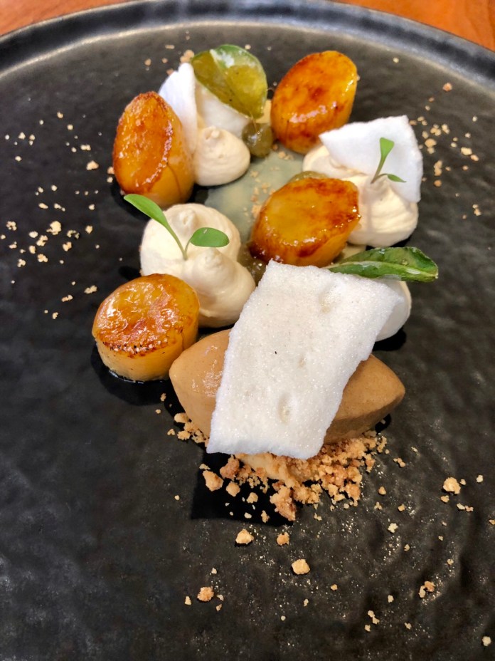 El escalope de foie gras tiene un enunciado que lo hace parecerse a un desayuno: granola, manzana y almendras pero tiene mucho más que eso y todo combina bien con el excelente hígado del pato, concretamente una espuma de café y una crema de pistachos que además de embellecerlo lo redondean.