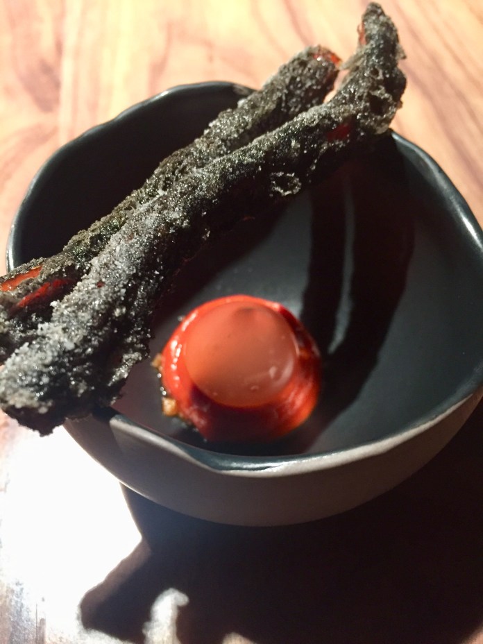 También original y de gran intensidad es el pimiento rojo en tempura de verduras (sobre todo apio) y salsa de pimientos y vinagre ahumado. Los palitos de pimiento, que parecen quemados y utilizan el carbón vegetal para conseguir ese efecto, aumentan su sabor con la deliciosa salsa consiguiendo además un bello contraste de color. Recuerdan mucho una gran obra de Quique Dacosta.