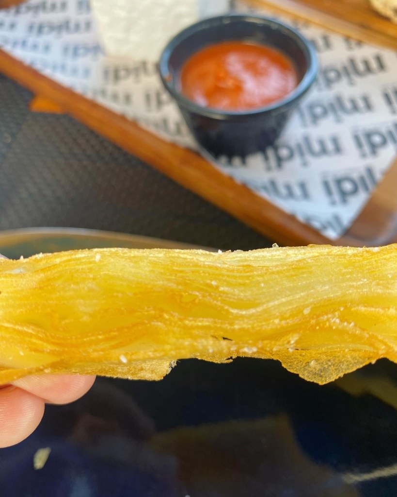 Me encanta la merluza pero no estaríamos en Cádiz si no hubiera atún y la chuleta de este pescado es un bocado imprescindible inteligentemente planteado porque la excesiva grasa de la parpatana se refresca y aligera con una buena salsa anticuchera sobre la que se supone una chalaca (cebolla roja, limón, jengibre y guindilla).