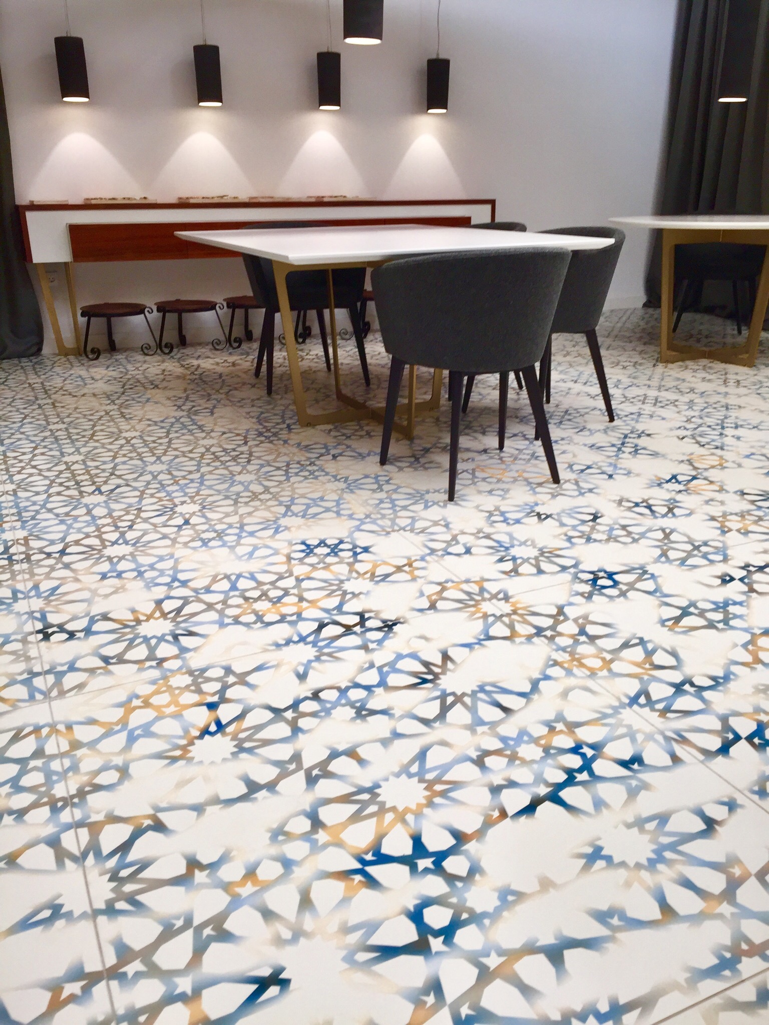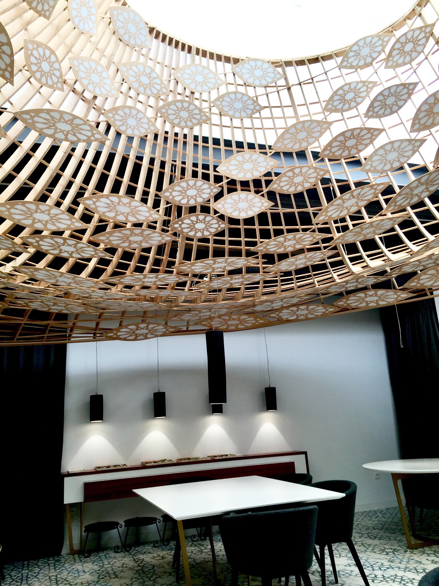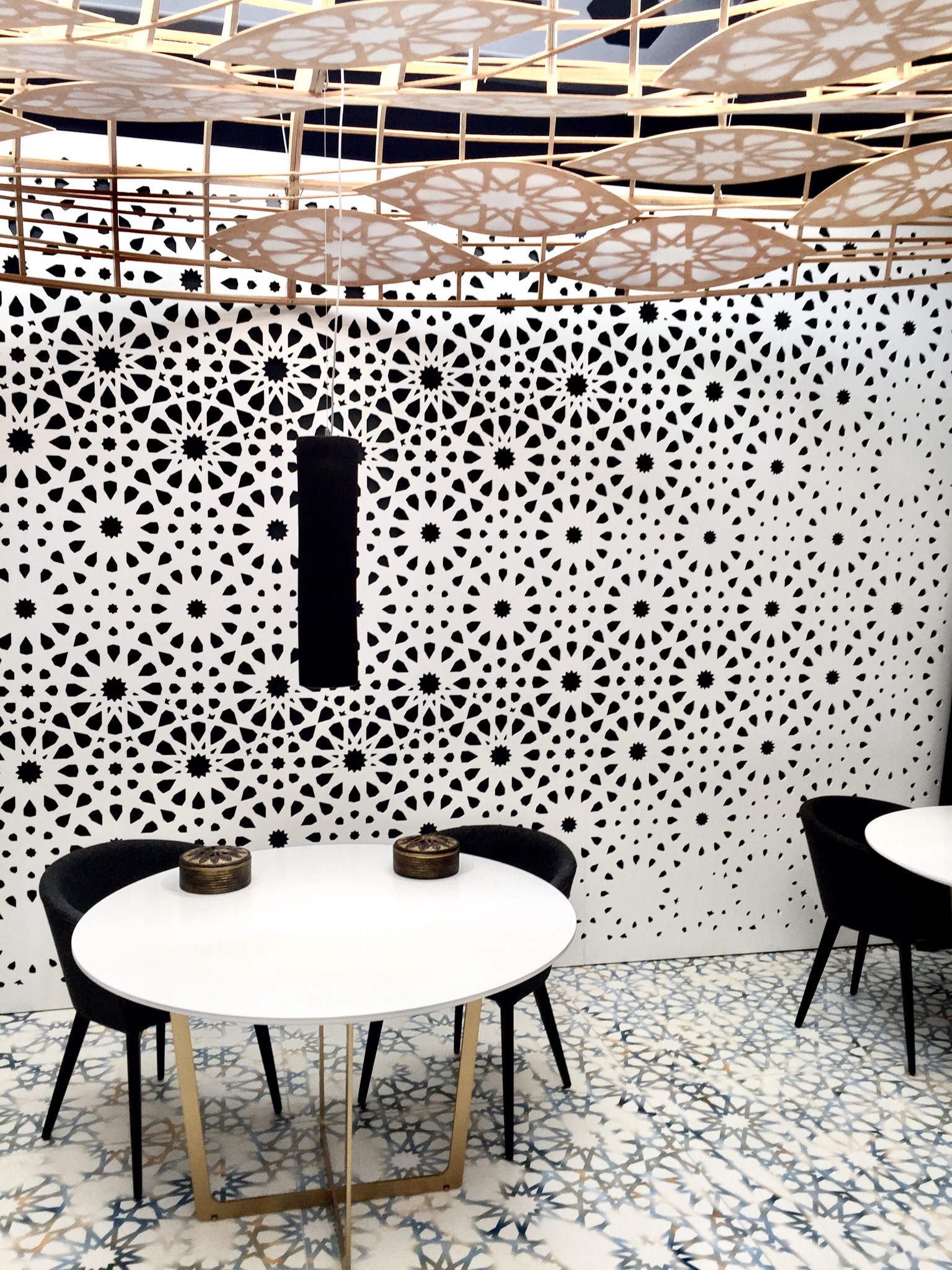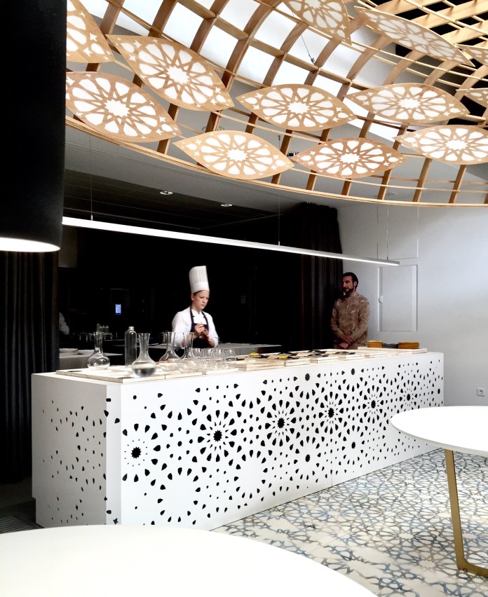 El acceso al comedor desde tan gran oscuridad es un choque lumínico, del negro al blanco absoluto, una blancura inundada de luz natural que entra a través de un gran lucernario. Todo es aséptico e impoluto y domina el blanco a pesar de la profusión de lacería y ataurique, muy difuminada, que cubre tanto el suelo como los paneles del techo. Una decoración híbrida entre 2001, Una Odisea en el espacio y Scherezade. Los desconcertantes uniformes metalizados de los camareros (Issey Miyake de andar por casa) realzan el efecto sideral.