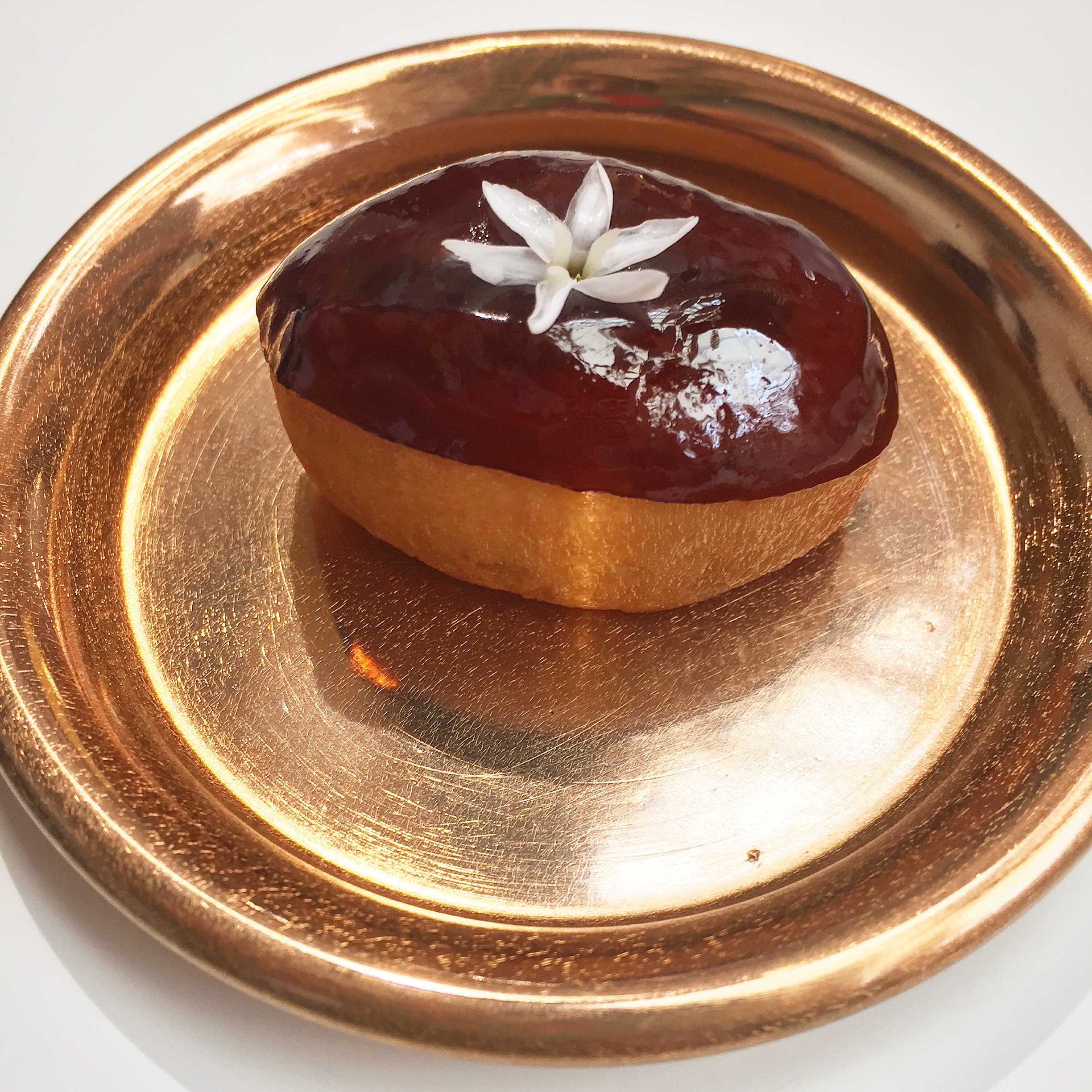 Los tres primeros aperitivos llegan juntos. Felizmente, porque el primero me asustó bastante. Las mirka de perdiz con escabeche de rosas tiene un excesivo aroma a agua de rosas. Nuestro paladar no está demasiado acostumbrado a ella y aquí se emplea con generosidad haciendo que sepa solo a eso y lo que es peor, a colonia.