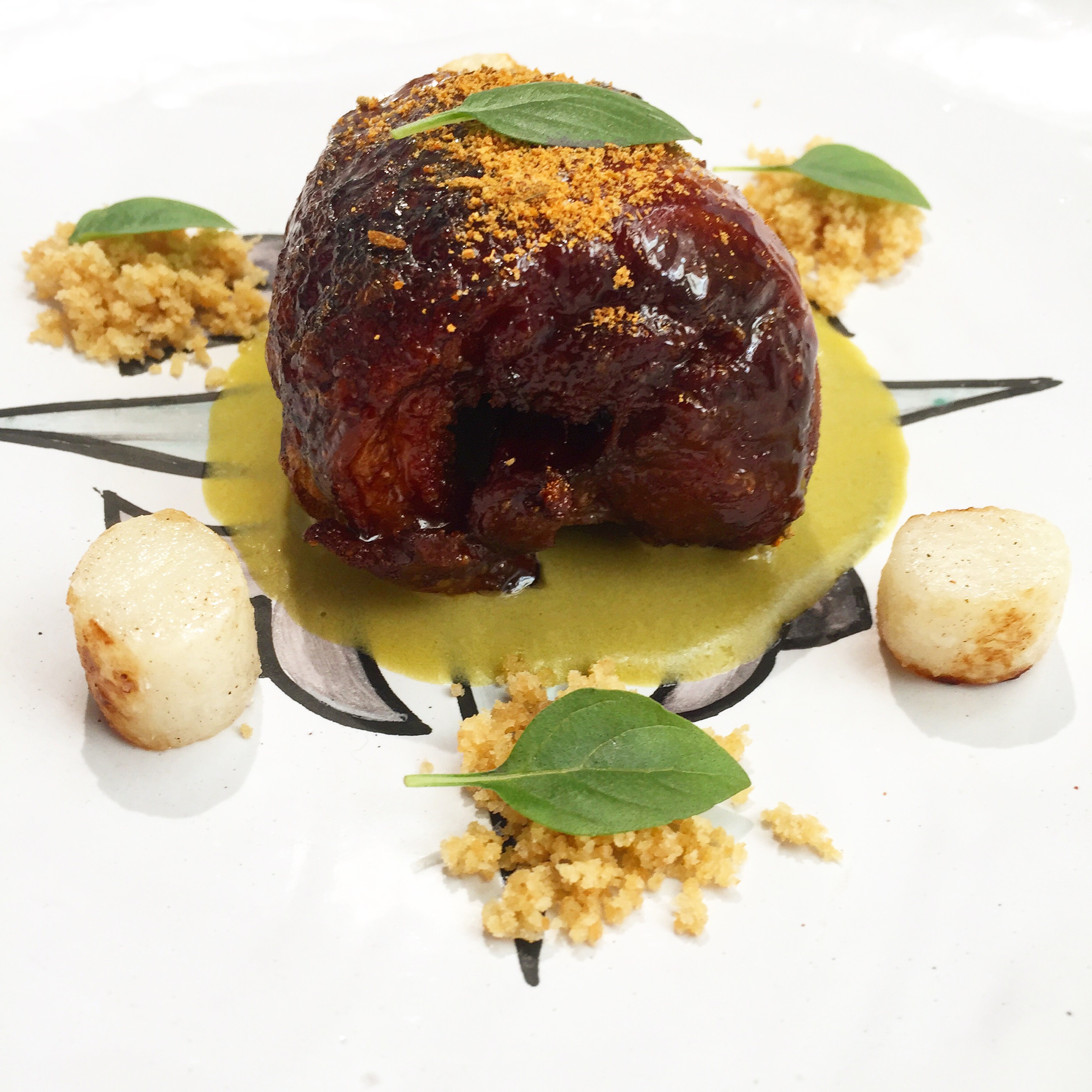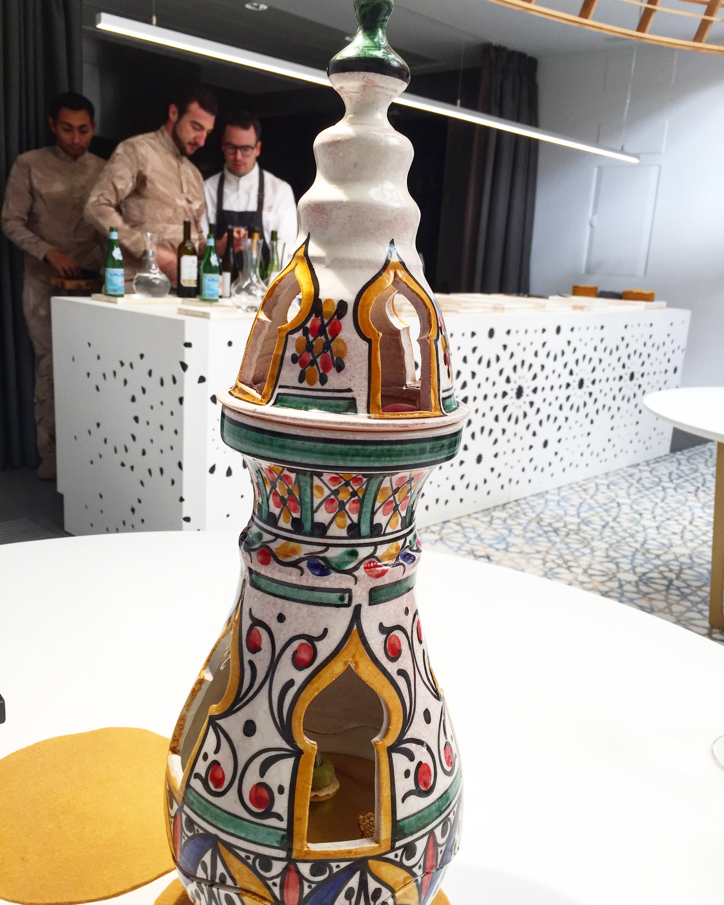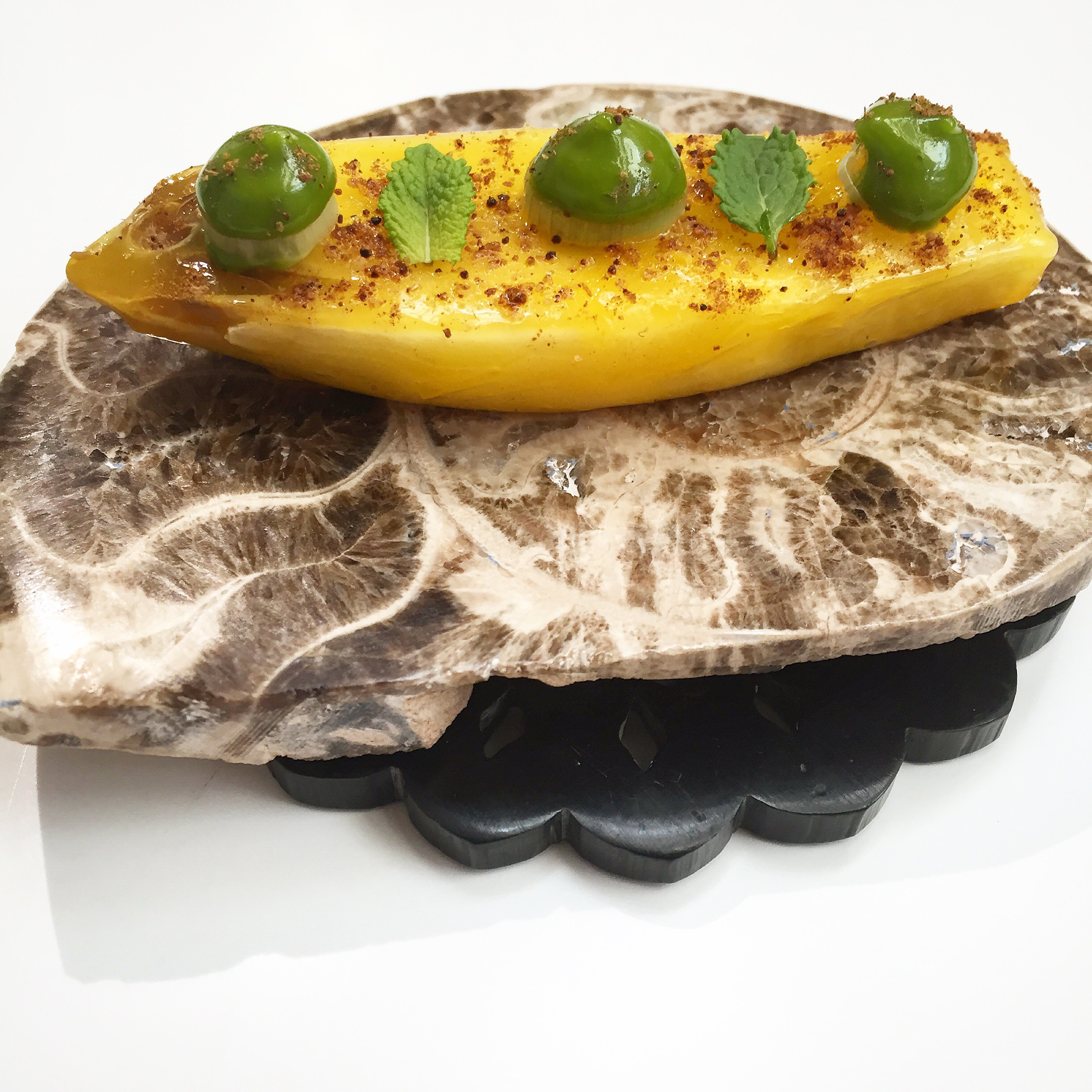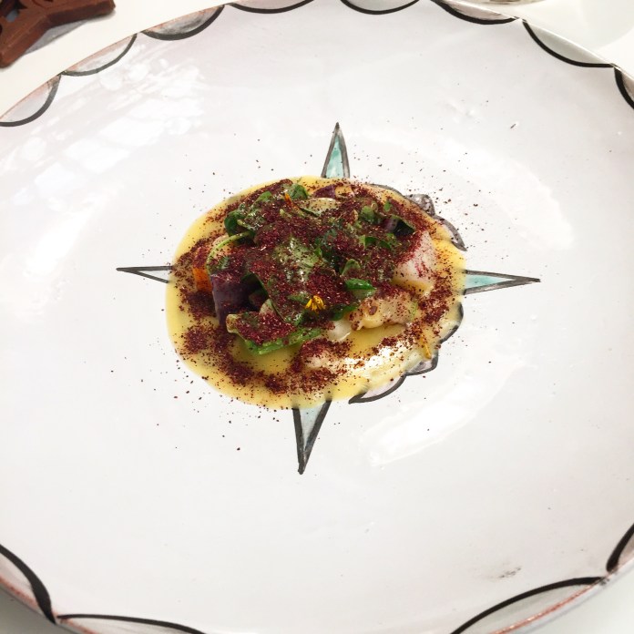 La menestra guisada, yema de huevo emulsionada con mantequilla de maeiz (cabra) ahumada y karkadé (hibiscus) es un buen plato vegetal, fresco, crujiente y alegrado por la mantequilla y el huevo. La presentación no es tan bella como las otras pero pronto verán que ello es una excepción porque, ya se ha dicho, esta es una bellísima cocina.