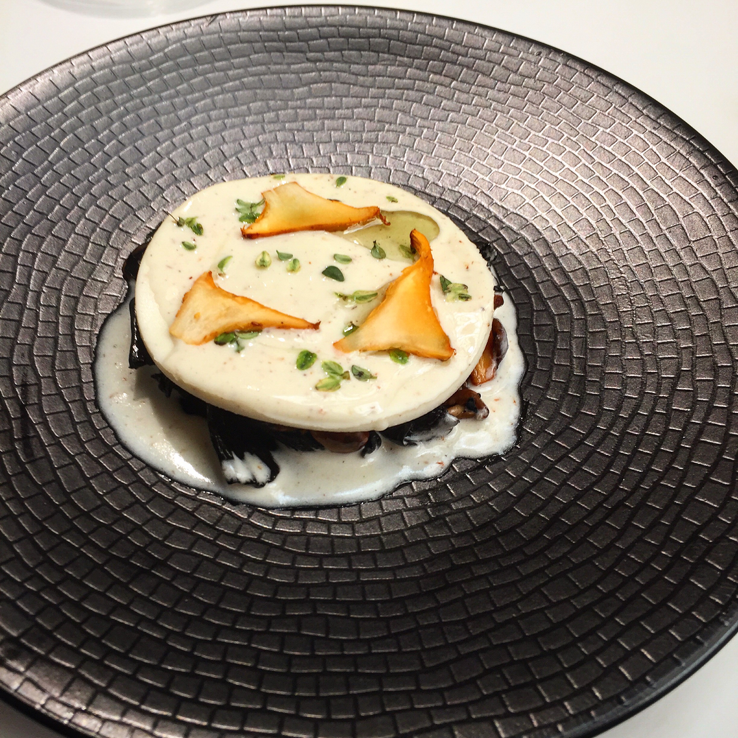 Setas salteadas con salsa de oveja esconde bajo una sólida bechamel un sabrosisimo revoltillo de senderuelas, rebozuelos trompeta de la muerte. Sabores y texturas perfectas aunque la temperatura casi fría de la bechamel contrasta mal con lo caliente de las setas. Seguro que cuando vayan ya lo habrán resuelto.