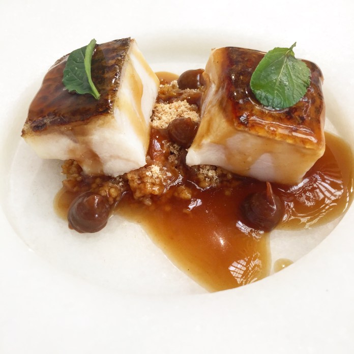 Lubina semicruda con alcuzcuz especiado, ciruela y fondo de gallina tiene un punto de cocción perfecto. Afortunadamente no está tan cruda como anuncian sino en el punto justo. El pescado, cortado en dados, es magnifico y la compañía, a pesar de su personalidad, es lo suficientemente suave para no nublar el delicado sabor de la lubina.