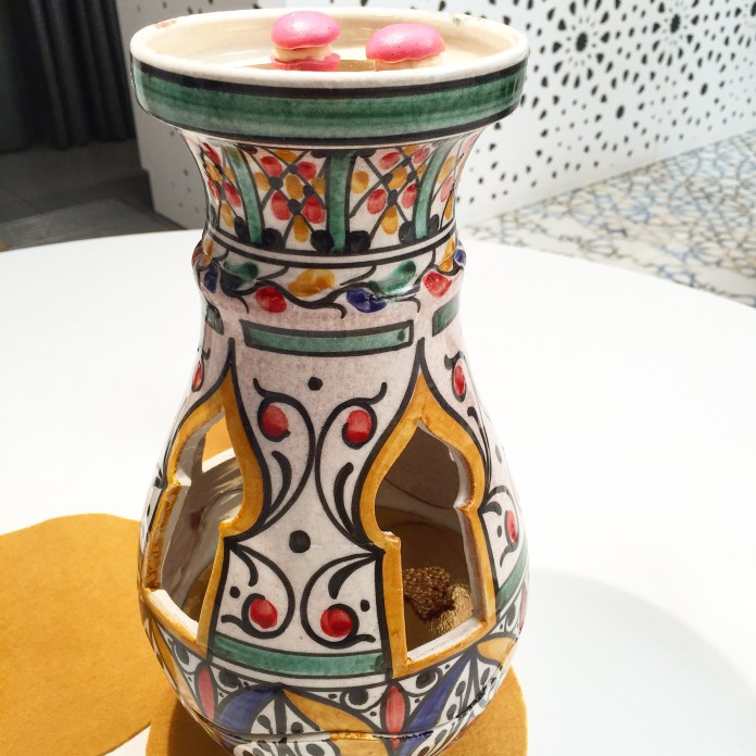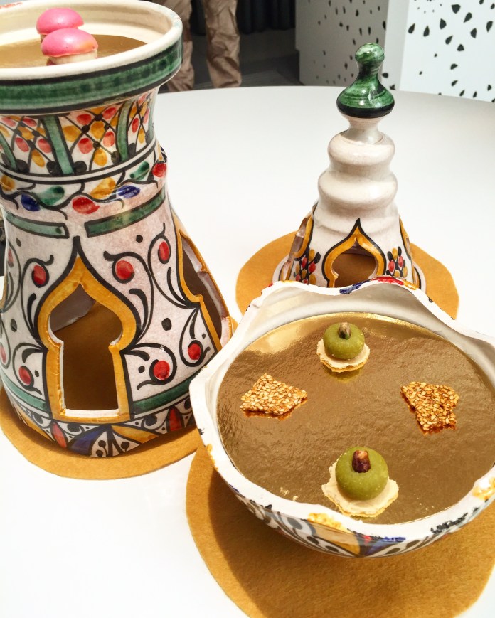 Como no soy experto en cocina andalusí del siglo X nada que decir sobre ella, pero sí les contaré qué me parece esa cocina mil años más tarde. Comenzamos con un refresco de sandía, agua de rosas y vinagre, para mi gusto, mucho vinagre pero también sensaciones frescas y agradables, la primera, beberlo de una frasquito que parece de perfume.