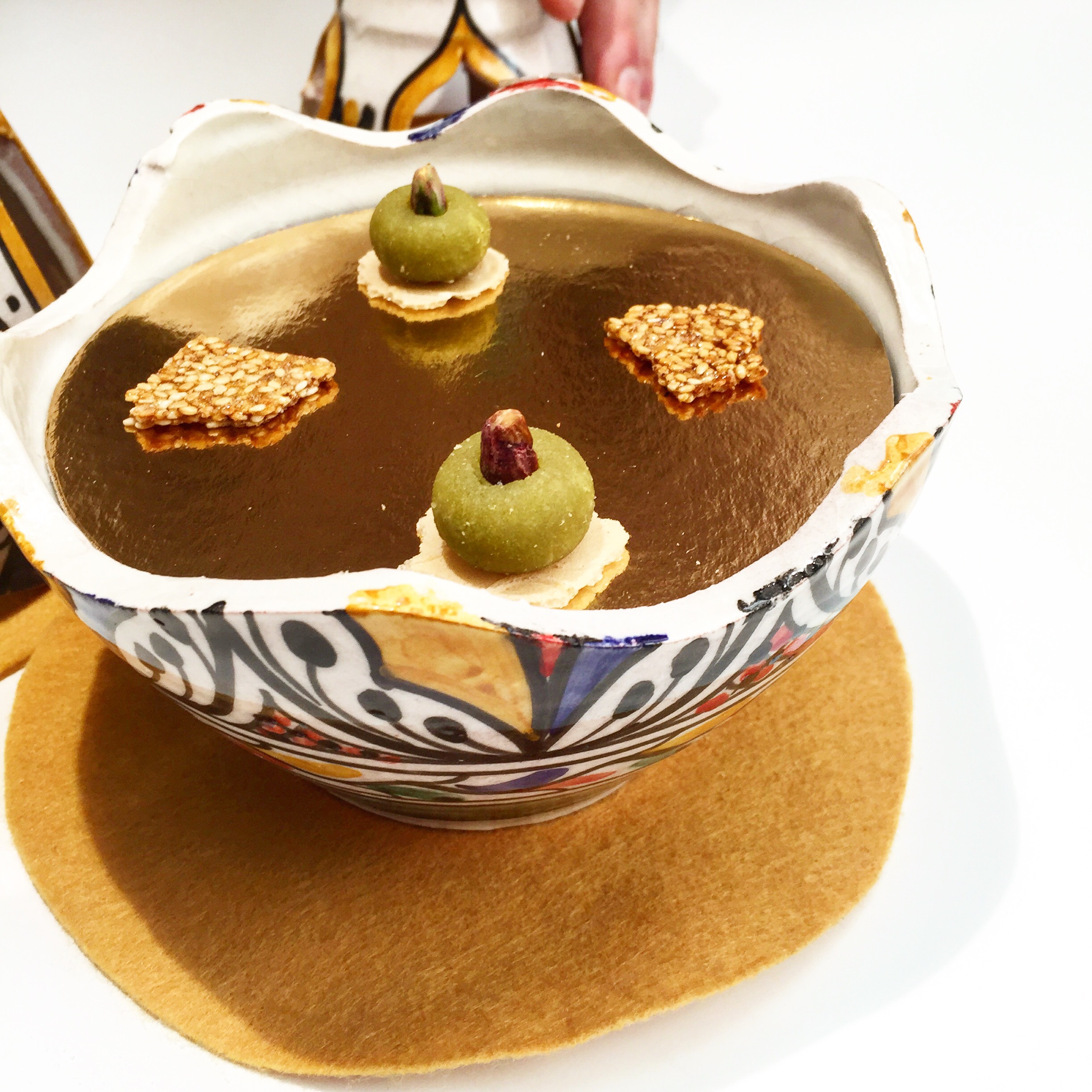 El karim de piñones, melón de otoño, erizo del Sáhara y orégano fresco es una crema diferente llena de sabores dulces y en la que destaca por su originalidad ese erizo (así llamado porque lo parece) que revienta como huevas de pez volador cuando en realidad es un excelente cereal.