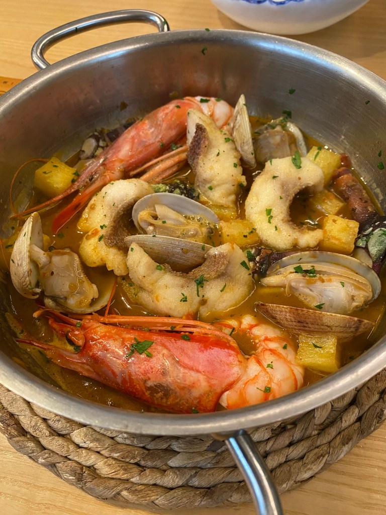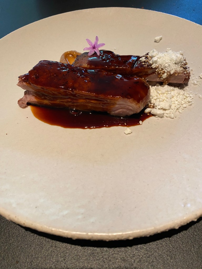 Cuando veo fabes no resisto y estas, de Luarca, con jabalí son mantecosas y llenas del sabor de un potente ragú de caza con trompetas de la muerte. Mucha profundidad en la salsa y gran ternura en la carrillera del jabalí a la brasa. Un plato muy redondo.