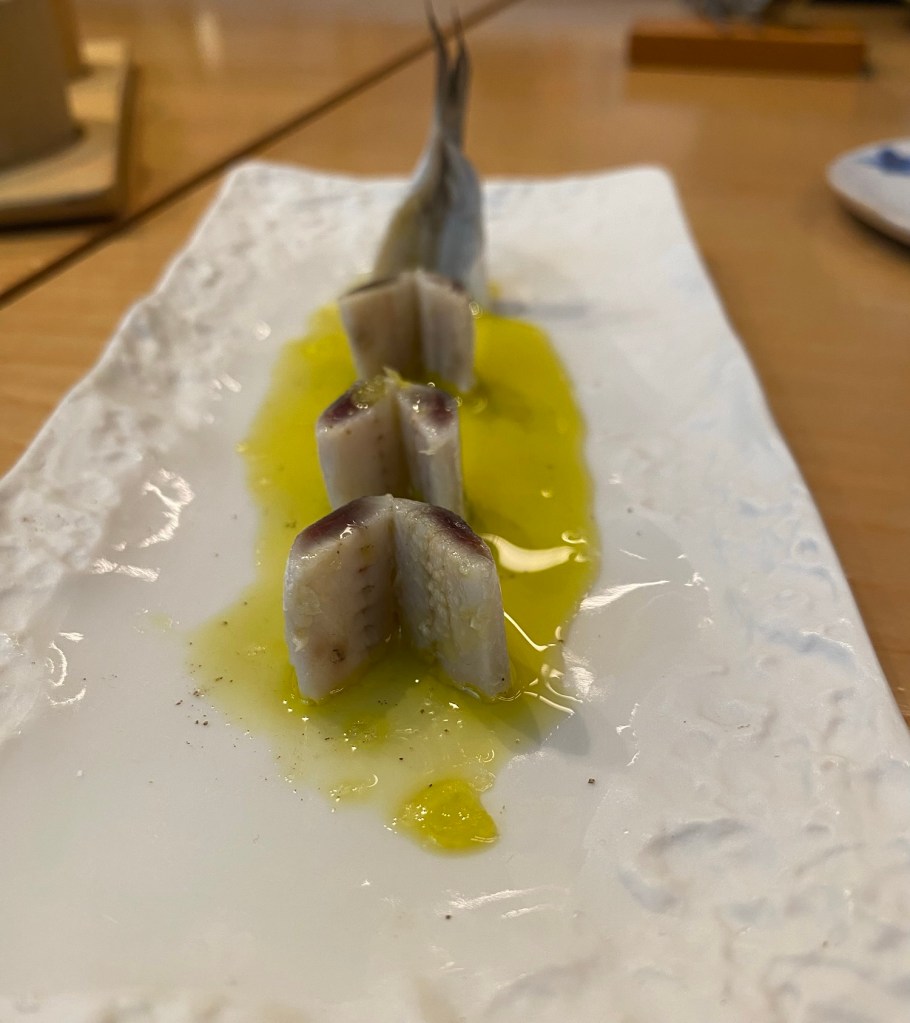 El mero tiene una piel tan crujiente como nunca (la llaman torrezno marino) y se debe a una técnica de desescamado llamada sukibiki. La carne, madurada una semana, está muy jugosa y se moja en una salsa espumosa del pescado con almendras ahumadas. Súper receta.