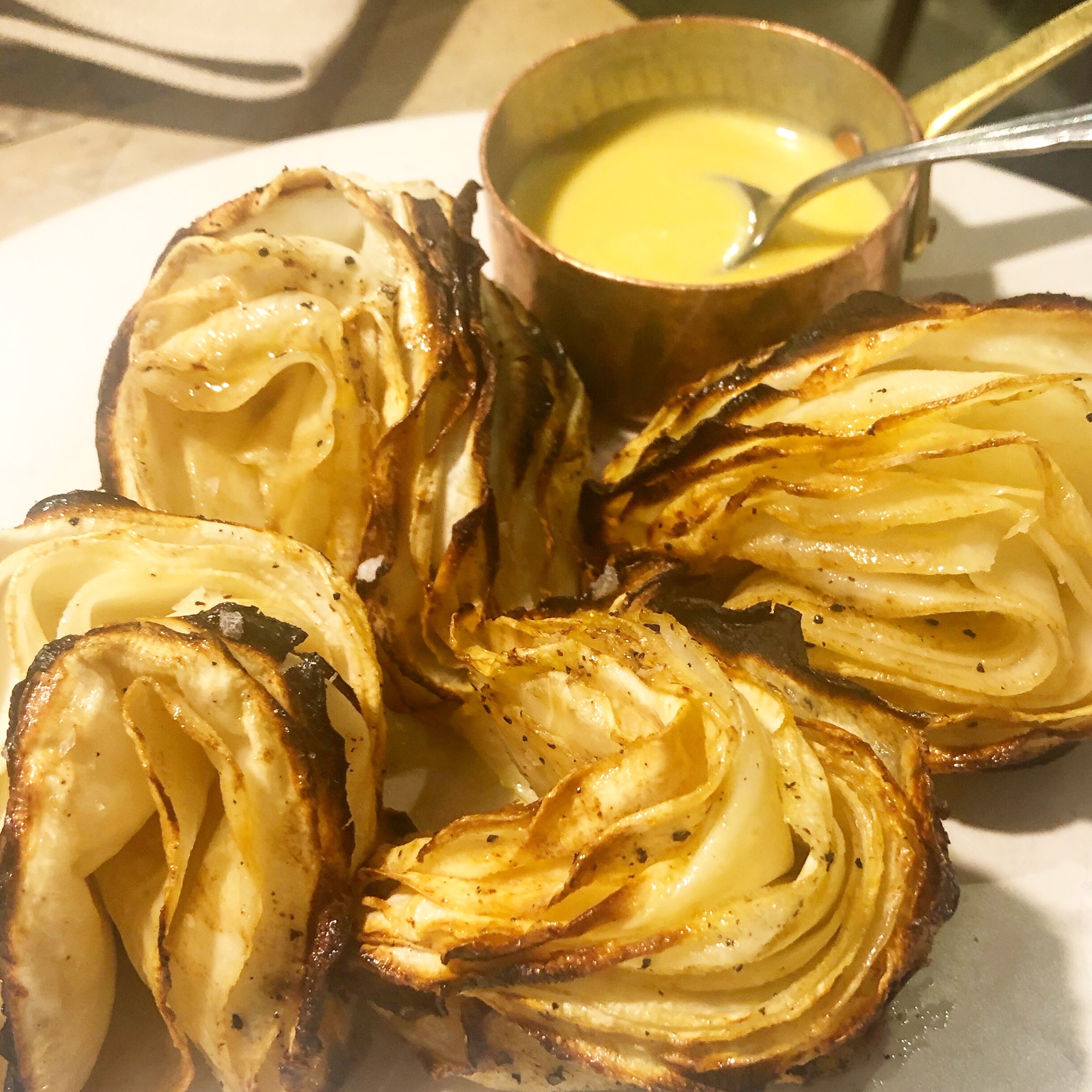 Me ha encantado el celeri rustido porque parece flores. Se corta la verdura en finas láminas redondas que luego se superponen y se doblan en cuatro. Nada más. Después un suave salteado en mantequilla y un resultado tostado, jugoso y con sabor a pastel francés. Por si acaso se quiere más, se puede mojar con una especie de holandesa que le queda muy bien.