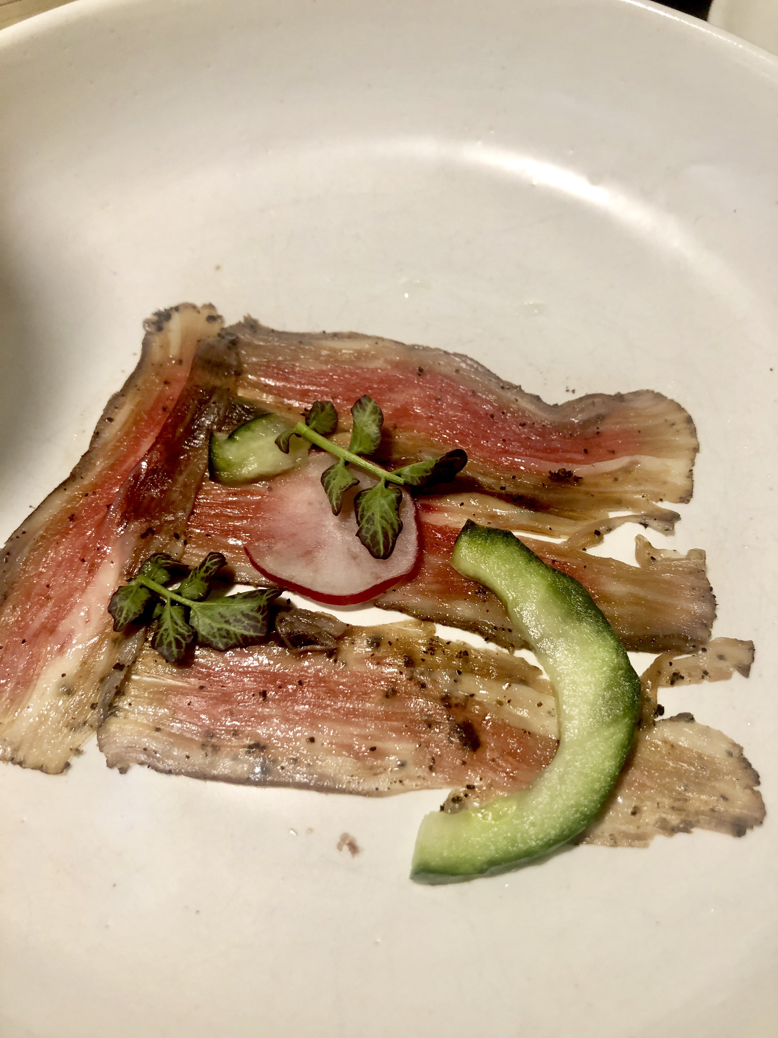 Y como todo buen hotel necesita un buen restaurante, han tenido la feliz idea de sacar a Yeyo Morales de Ramsés y darle el espacio y la libertad que necesitaba para desarrollar su cocina. Me alegro de haber intuido su talento cuando, única vez, hablé bien de Ramsés en Oro falso, cocina real. Ahora empieza a desplegar su gran cocina en este nuevo restaurante  que ocupa el espacio del antiguo  Europa Decó, despojado ahora de animal print, cuero y horteradas varias. En el nuevo comedor destaca el blanco de los impolutos manteles y el rayado de las paredes de ébano, conservando tan solo del «esplendor» pasado una gran pared de teselas doradas ante la que se elaboran las entradas.